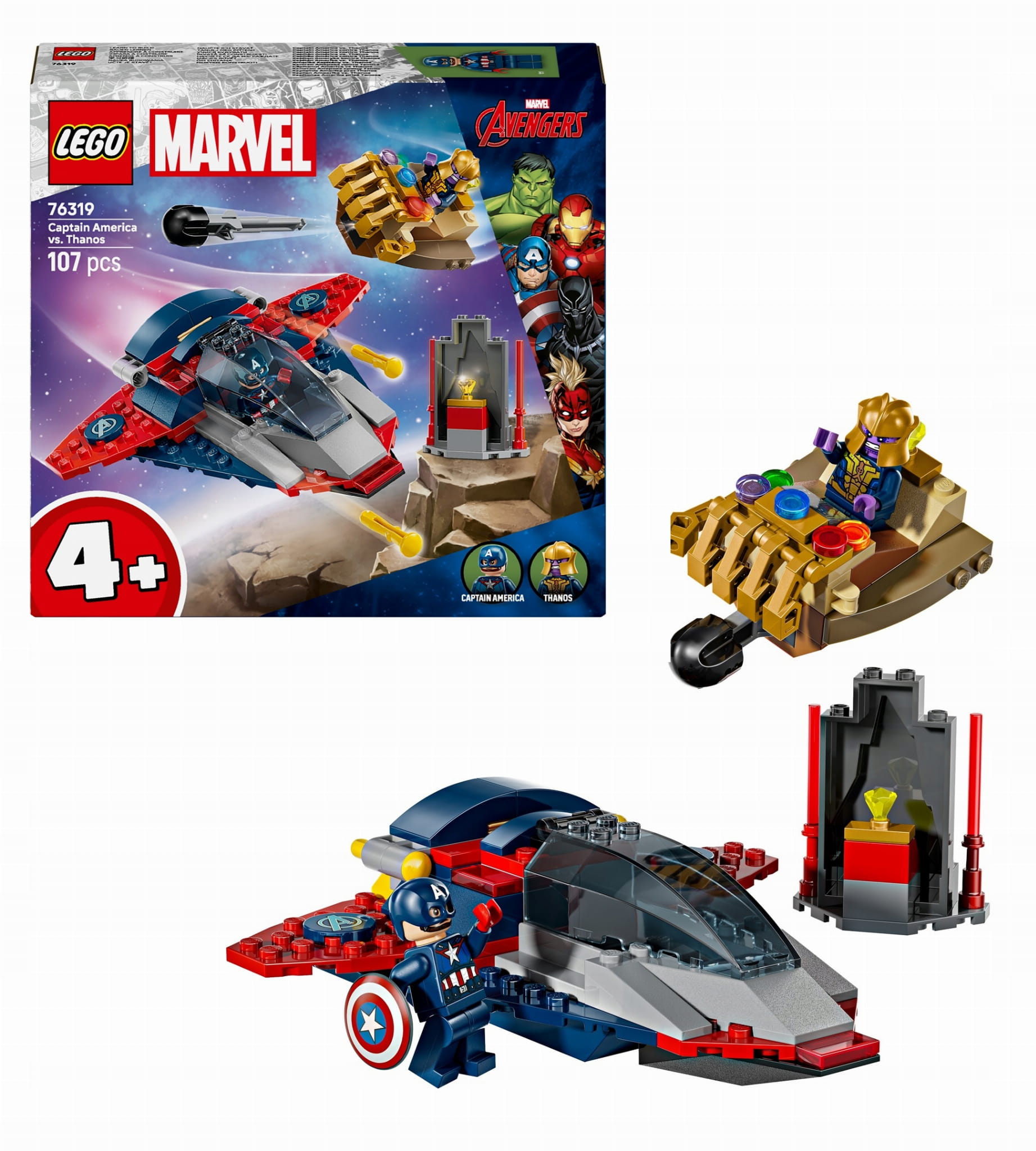 Zestaw zawiera dwie minifigurki: Thanosa w statku kosmicznym w kształcie Rękawicy Nieskończoności z ruchomymi „palcami” i wyrzutnią rakiet oraz Kapitana Amerykę w superszybkim Quinjecie z dwiema wyrzutniami klocków, otwieranym kokpitem i ukrytym schowkiem na tarczę.