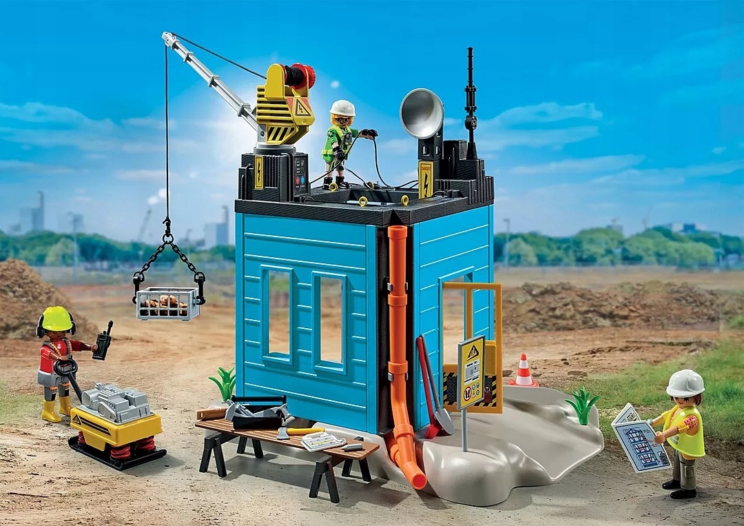 Pora wybrać się do pracy: plac budowy PLAYMOBIL z podstawą, elementami ściennymi, mocowaniem dachu z dźwigiem, a także trzema figurkami PLAYMOBIL i wieloma innymi ciekawymi dodatkami do wspaniałej zabawy w budowanie!