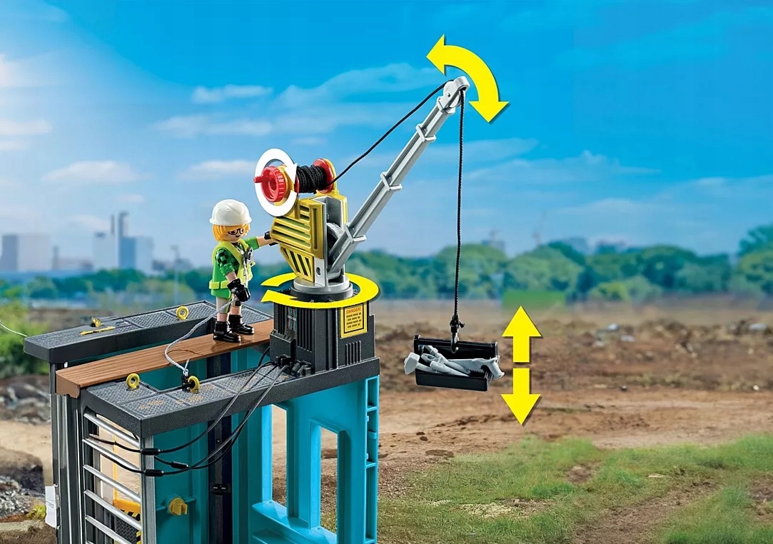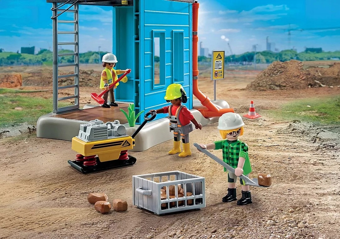 Ciekawy zestaw PLAYMOBIL zawiera sekcję budowlaną z ruchomym dźwigiem, trzy figurki PLAYMOBIL, ubijak do betonu, skrzynkę z narzędziami i wiele innych wspaniałych dodatków do wyjątkowej zabawy w odgrywanie ról.