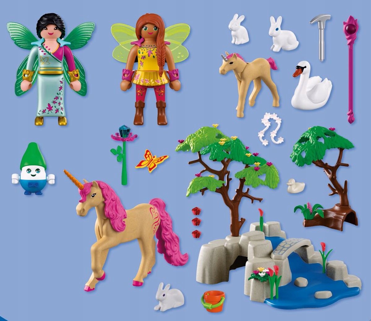 - Zwierzęta: 1 jednorożec, 1 źrebak jednorożca, 2 łabędzie, 2 pisklęta łabędzie, 1 zając leżący, 1 zając siedzący, 1 mały zajączek, 2 motyle;