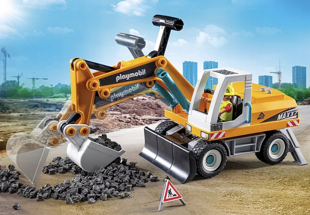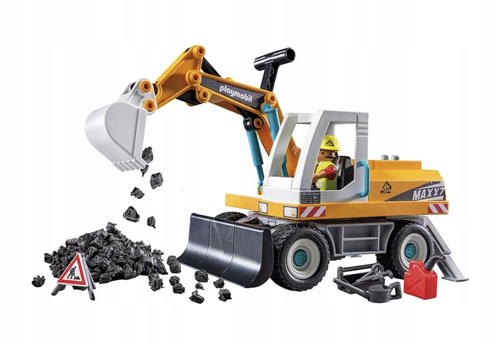 Zapraszamy na teren budowy z dużą koparką PLAYMOBIL! Ta imponująca maszyna jest gotowa stawić czoła każdemu zadaniu. Koparka ma przestronną kabinę kierowcy, ruchomą łopatę sterowaną za pomocą dzwigni i górną część obracającą się o 360°. Wysuń podpory, aby zwiększyć stabilność i z łatwością zabierz się do kopania i podnoszenia materiału budowlanego.