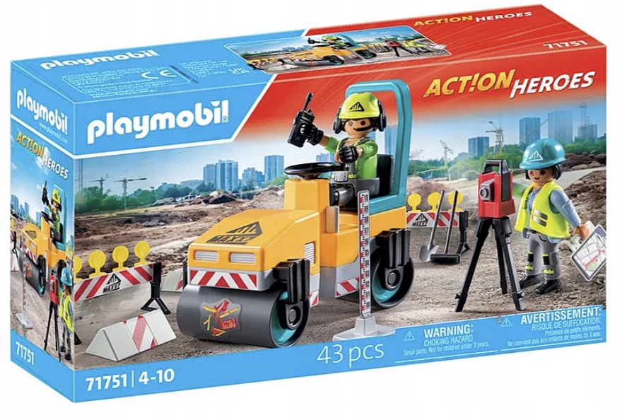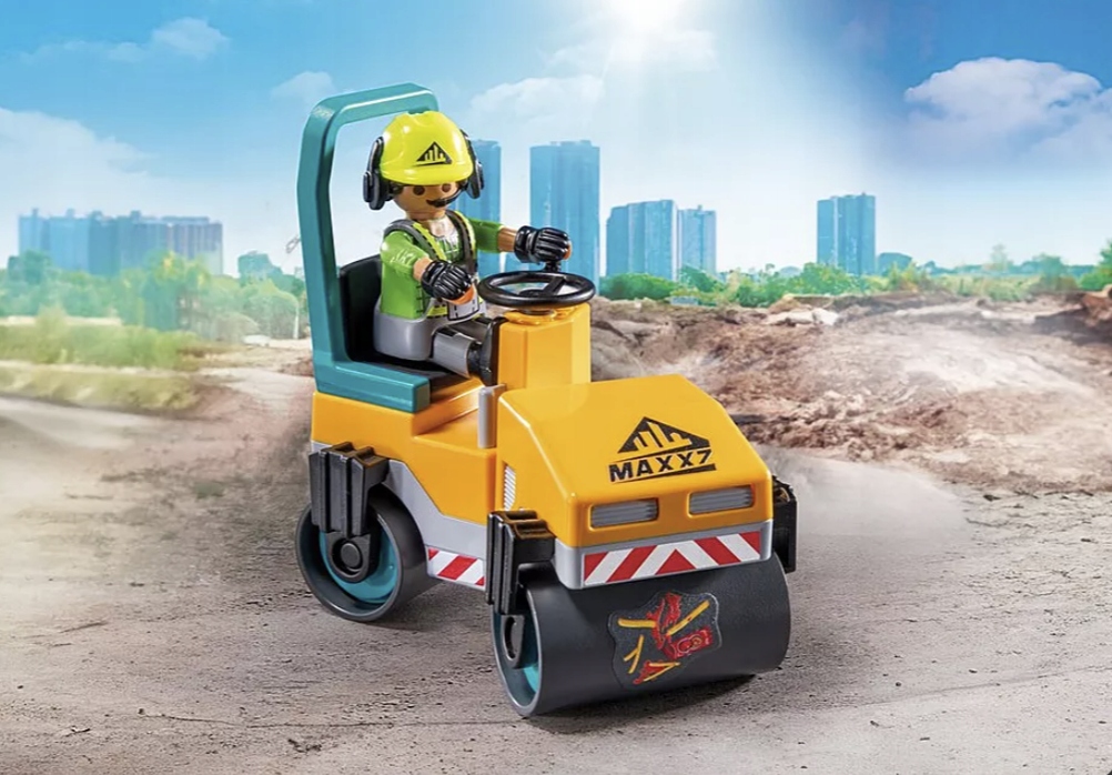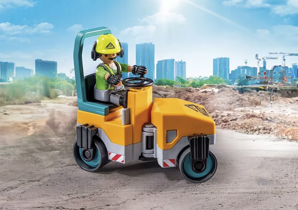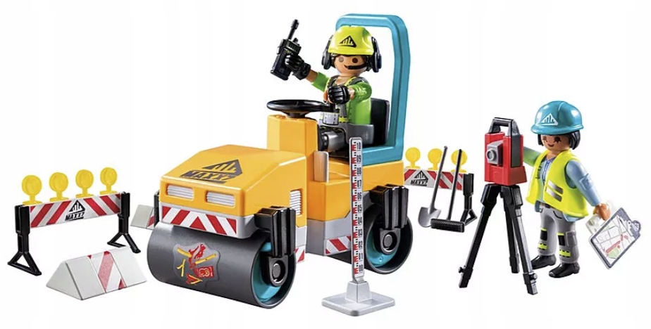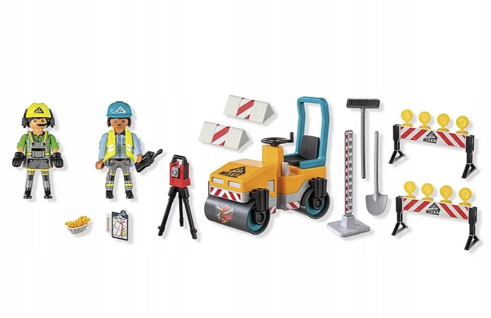 Ruszaj żwawo do pracy na placu budowy PLAYMOBIL! Obrotowe koła walca i siedzenie z możliwością ustawienia figurki sprawiają, że ubijanie asfaltu jest dziecinnie proste, a blokady drogowe z migającymi żółtymi światłami zapewniają bezpieczeństwo. Użyj dołączonych narzędzi, aby zapewnić doskonałe rozwiązanie każdego projektu. Dzięki szczegółowym akcesoriom, takim jak kaski, miotła, łopata i przenośne radio, zestaw ten ożywia autentyczną zabawę w roboty drogowe.