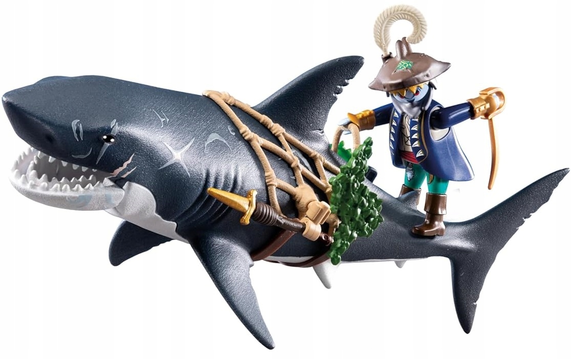 Pociągnij dźwignię, aby otworzyć ogromną paszczę rekina, w którą można złapać pirata. Po szybkim zwolnieniu dźwigni paszcza zamyka się automatycznie. Podczas swojej podróży przez siedem mórz, rekin-pirat trzyma się sieci potwora z wyciągniętą szablą w ręku.