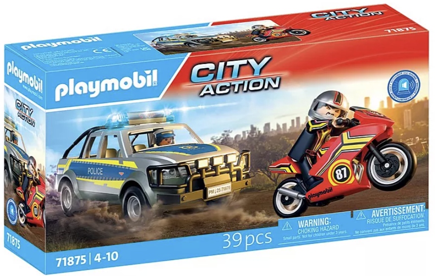 Ruszaj do akcji z zestawem PLAYMOBIL: Pościg policyjny z pick-upem! Rabuś pędzi na czerwonym motocyklu, ale dzielna policjantka jest tuż za nim – sygnały świetlne migają, a syreny wyją.