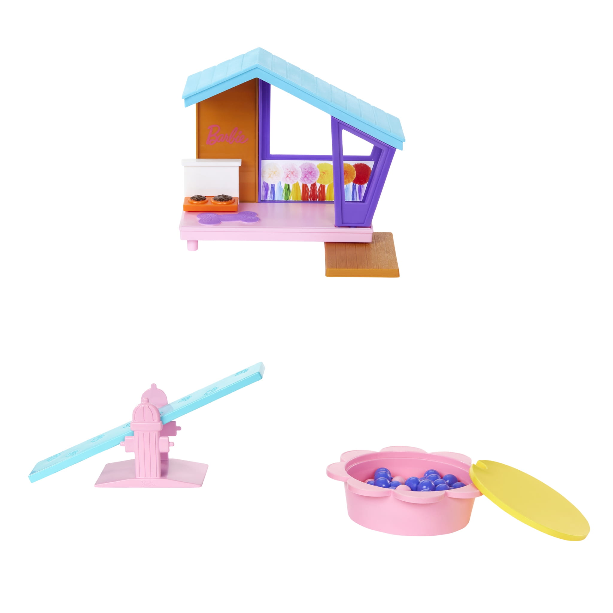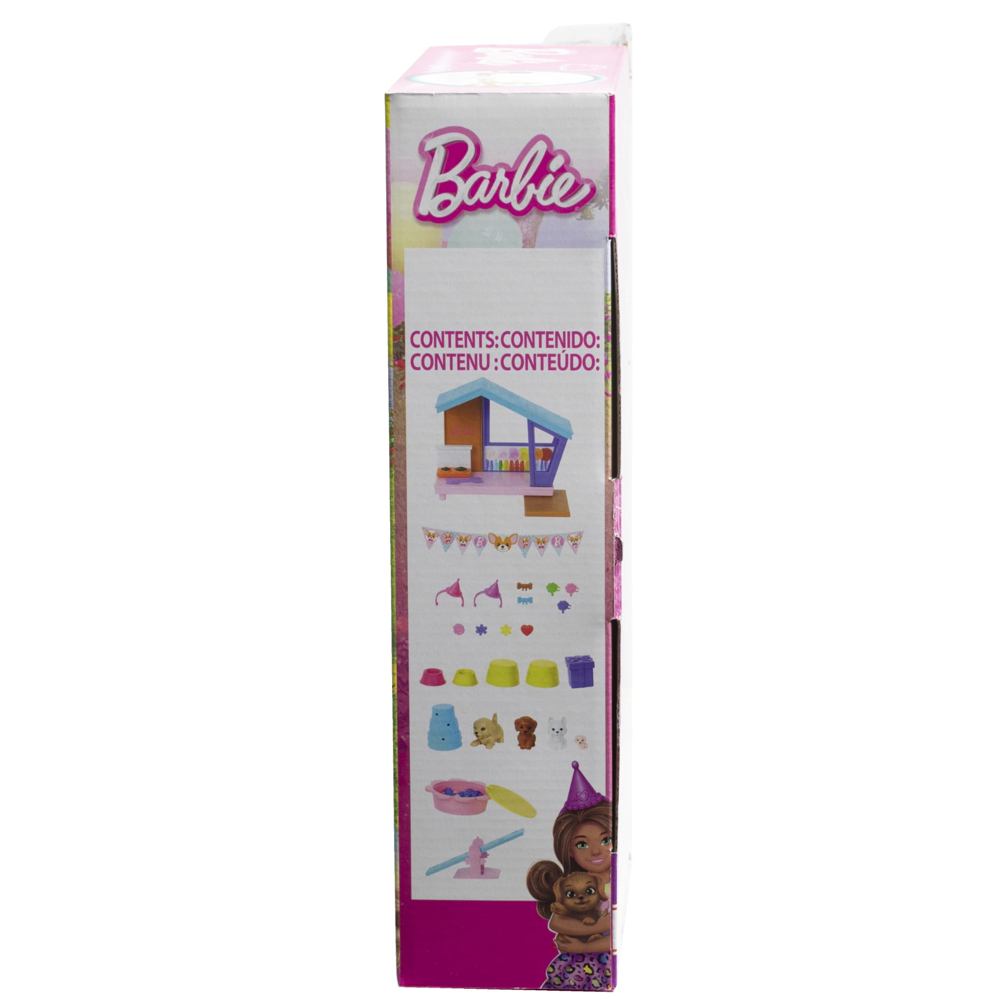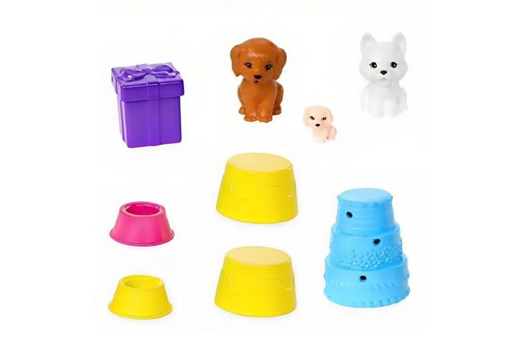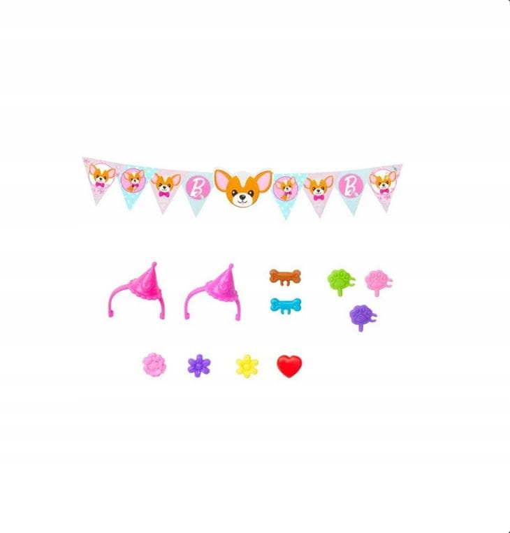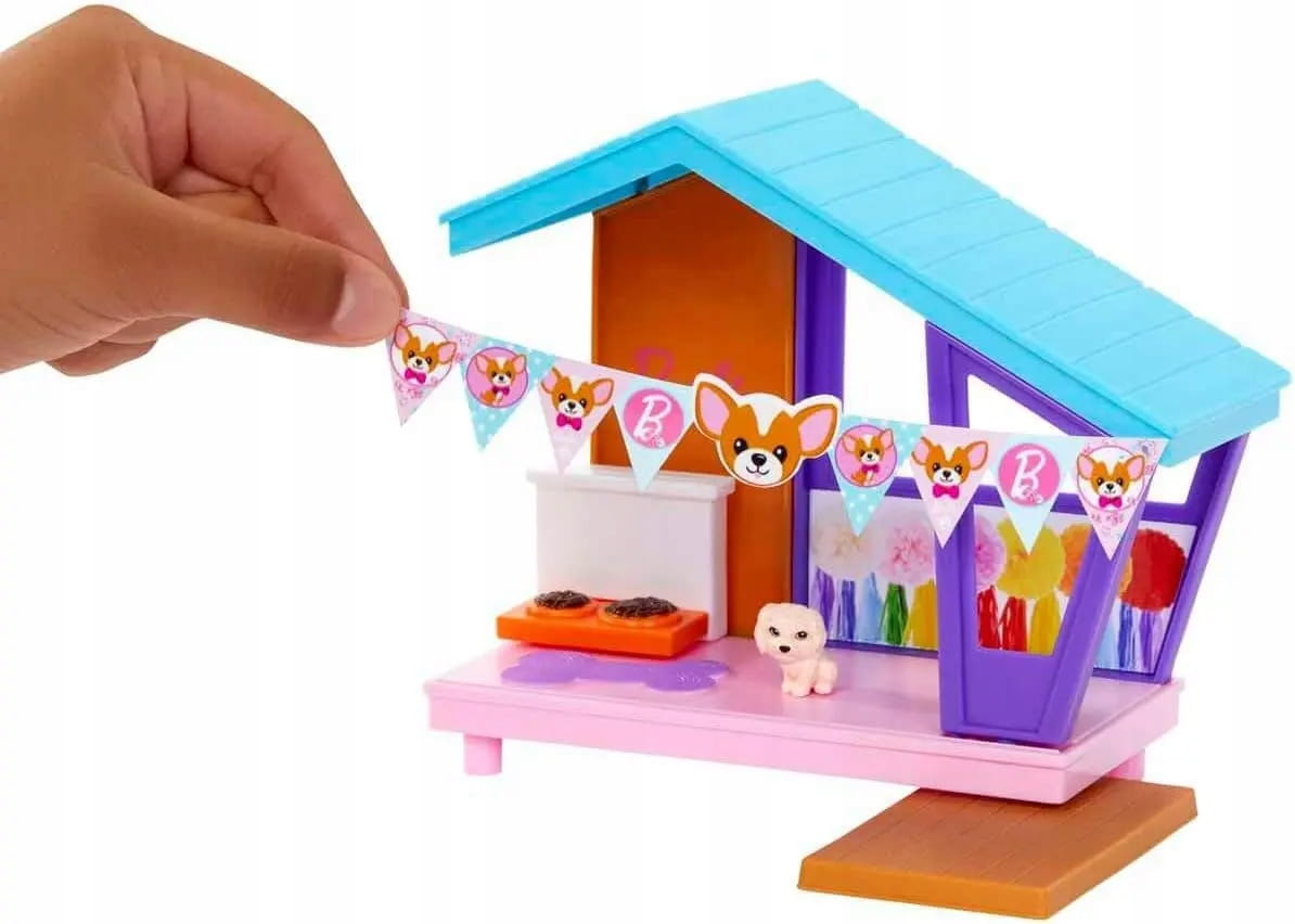 Chłopcy i dziewczęta mogą pomóc lalce Chelsea i jej przyjaciółce udekorować budkę dla psa: jest baner, który można zawiesić i ciasto z dopasowanymi częściami do zabawy, dekorując go!