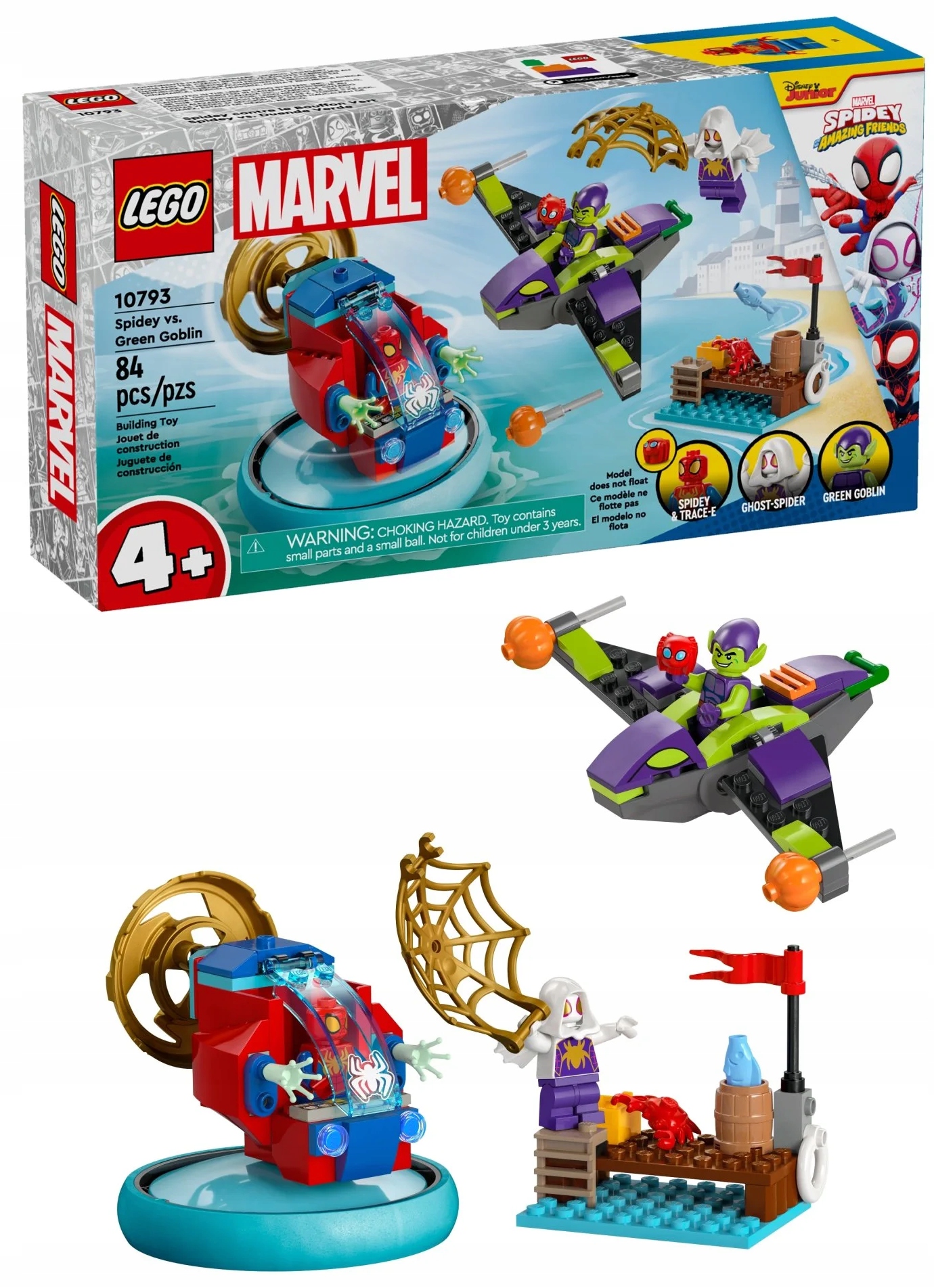 - Zestaw z pojazdem i bohaterami Marvela — zawiera minifigurki Spider-Mana, Zielonego Goblina i Ghost-Spider oraz duży klocek startowy umożliwiający szybkie rozpoczęcie zabawy