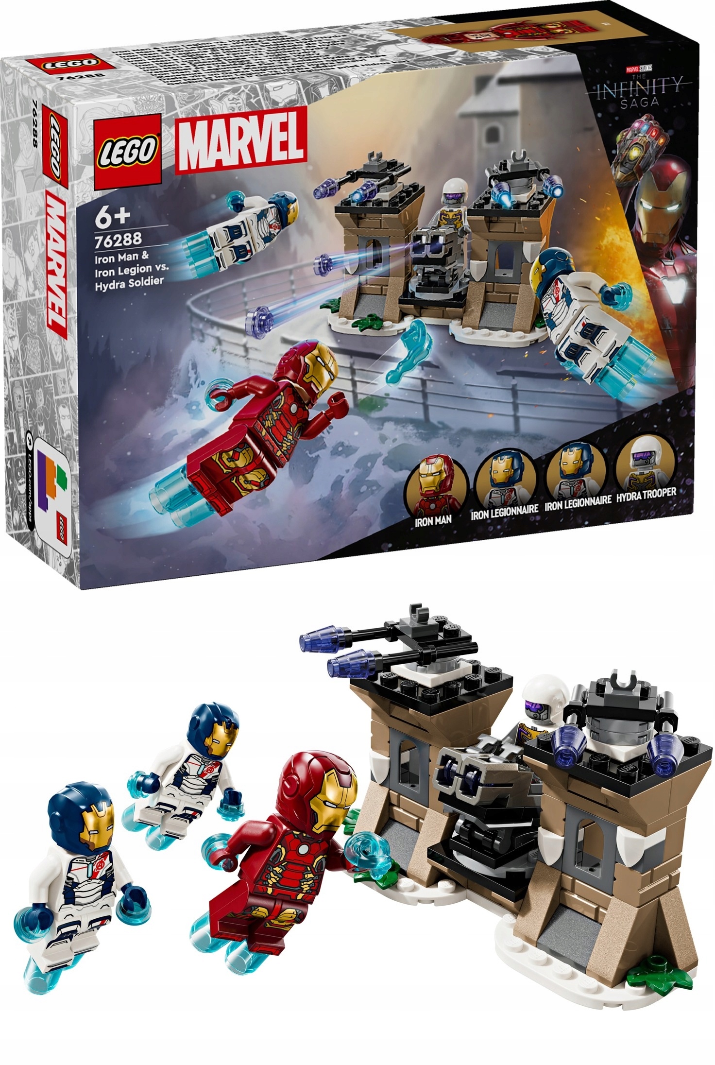 - Zestaw LEGO® Marvel z Iron Manem — dzięki zestawowi LEGO® Marvel Iron Man i Iron Legion kontra żołnierz Hydry dla chłopców i dziewczynek w wieku od sześciu lat dzieci mogą odegrać sceny z filmu Avengers: Czas Ultrona Marvela