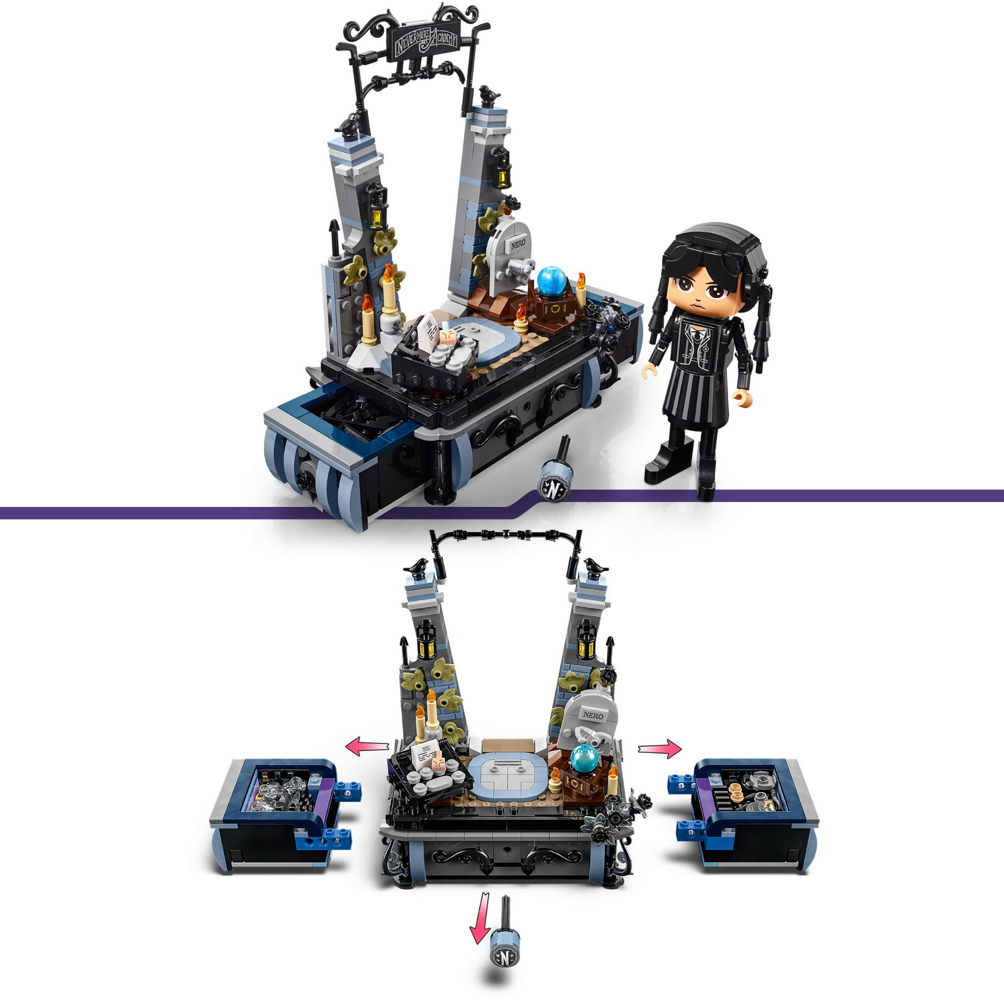 Całości dopełnia brama Akademii Nevermore i akcesoria, takie jak maszyna do pisania Wednesday, grób Nero, szklana kula i inne.