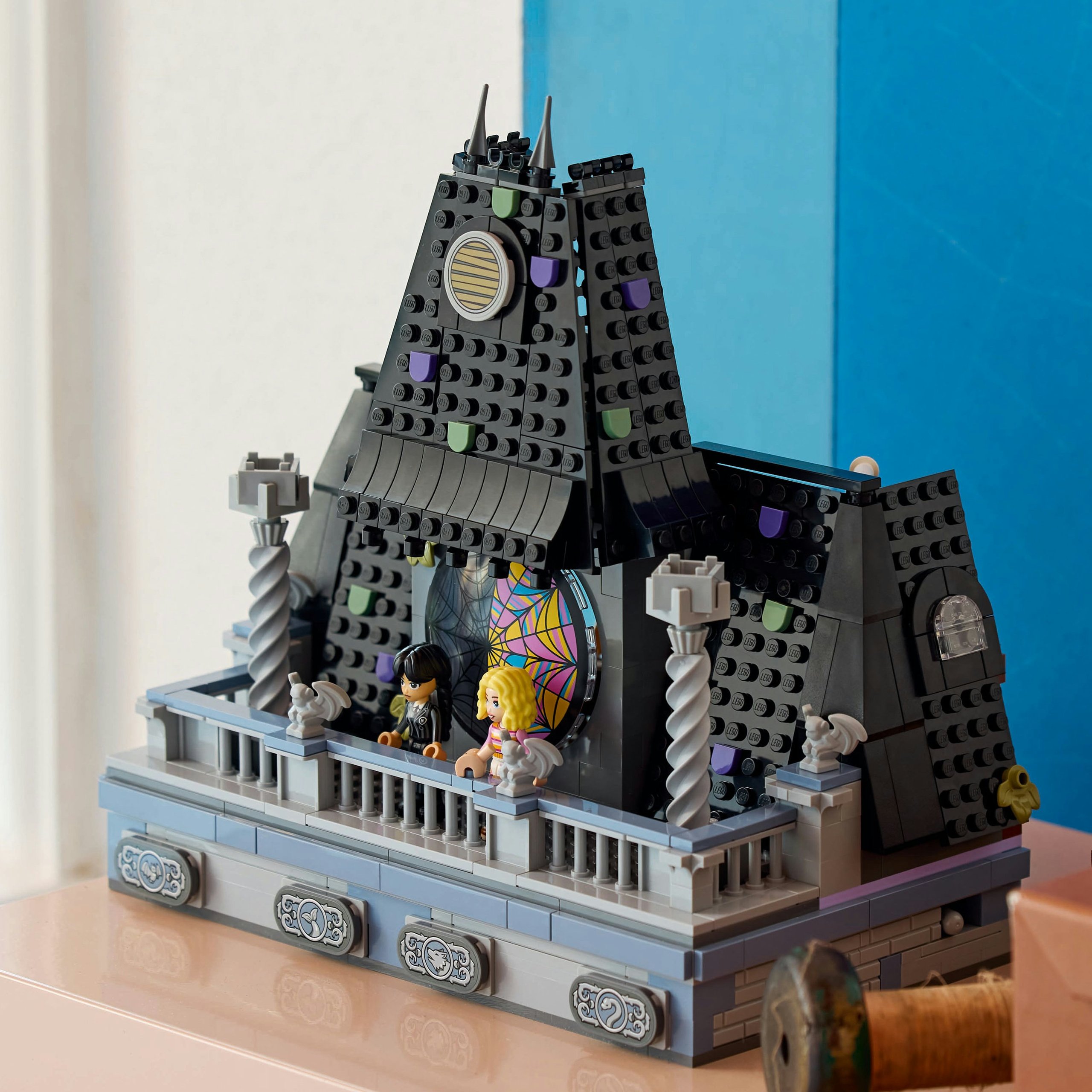 - Akademia Nevermore — zestaw zawiera pokój do zbudowania z otwieranym oknem w kształcie pajęczyny, podstawkę z przyciskami otwierającymi tajne szuflady oraz balkon z czterema gargulcami