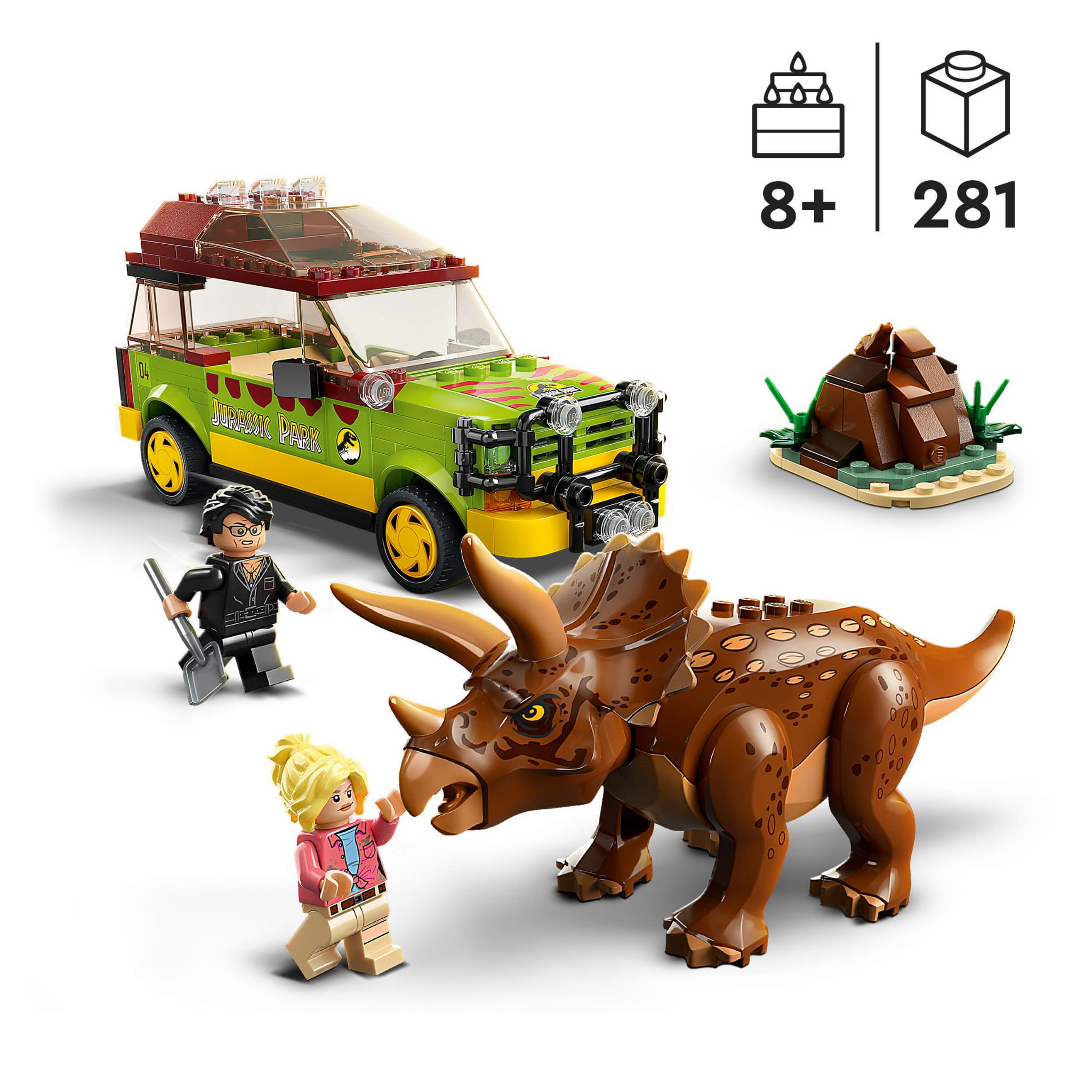 Dzieci, które interesują się dinozaurami i fajnymi samochodami, pokochają ten kolekcjonerski zestaw LEGO® Jurassic World Badanie triceratopsa (76959).