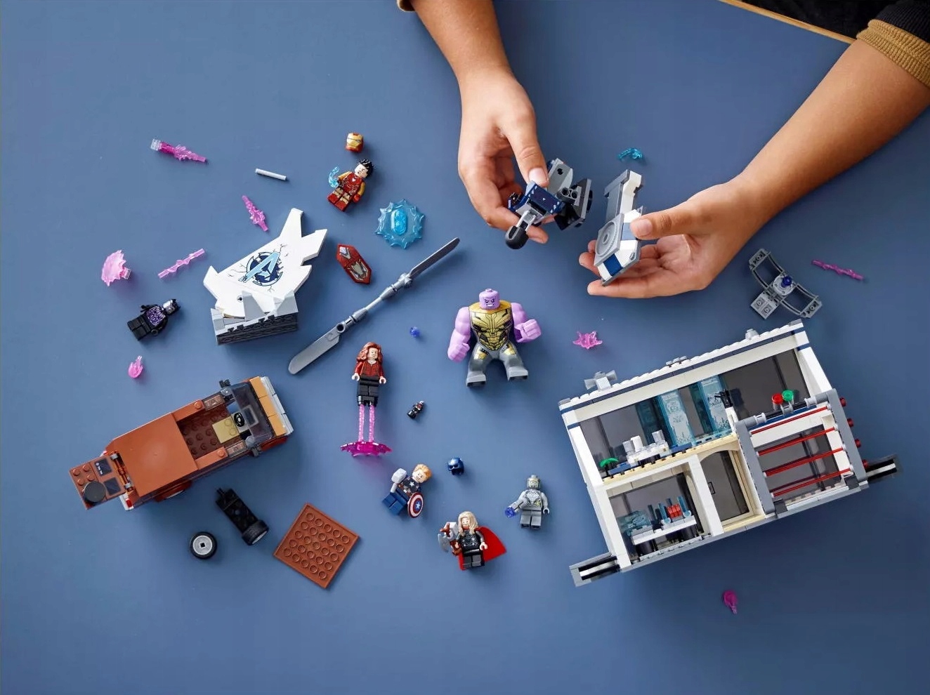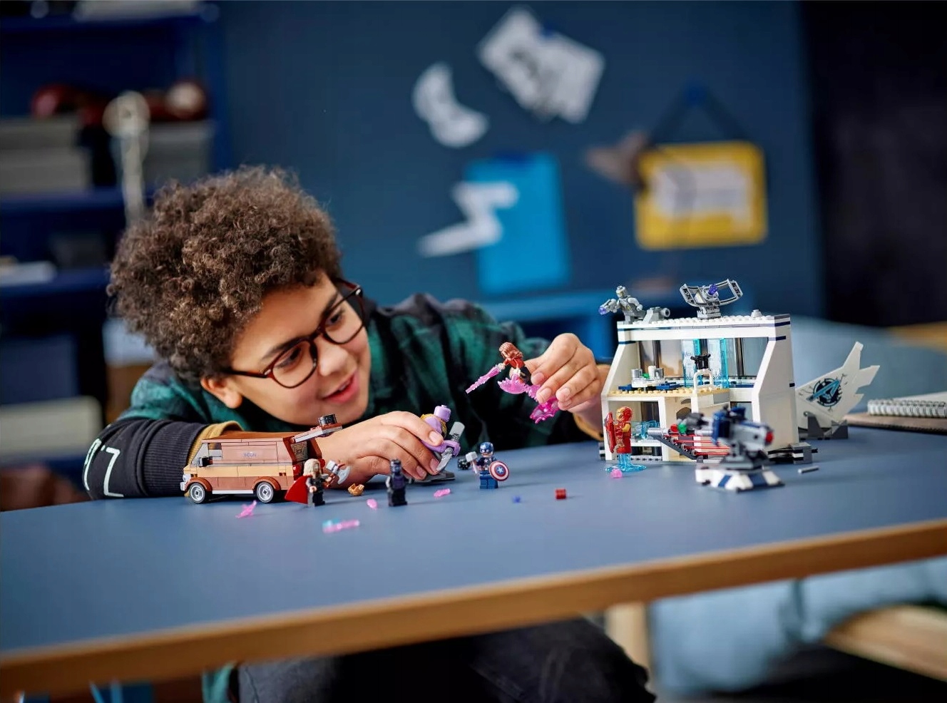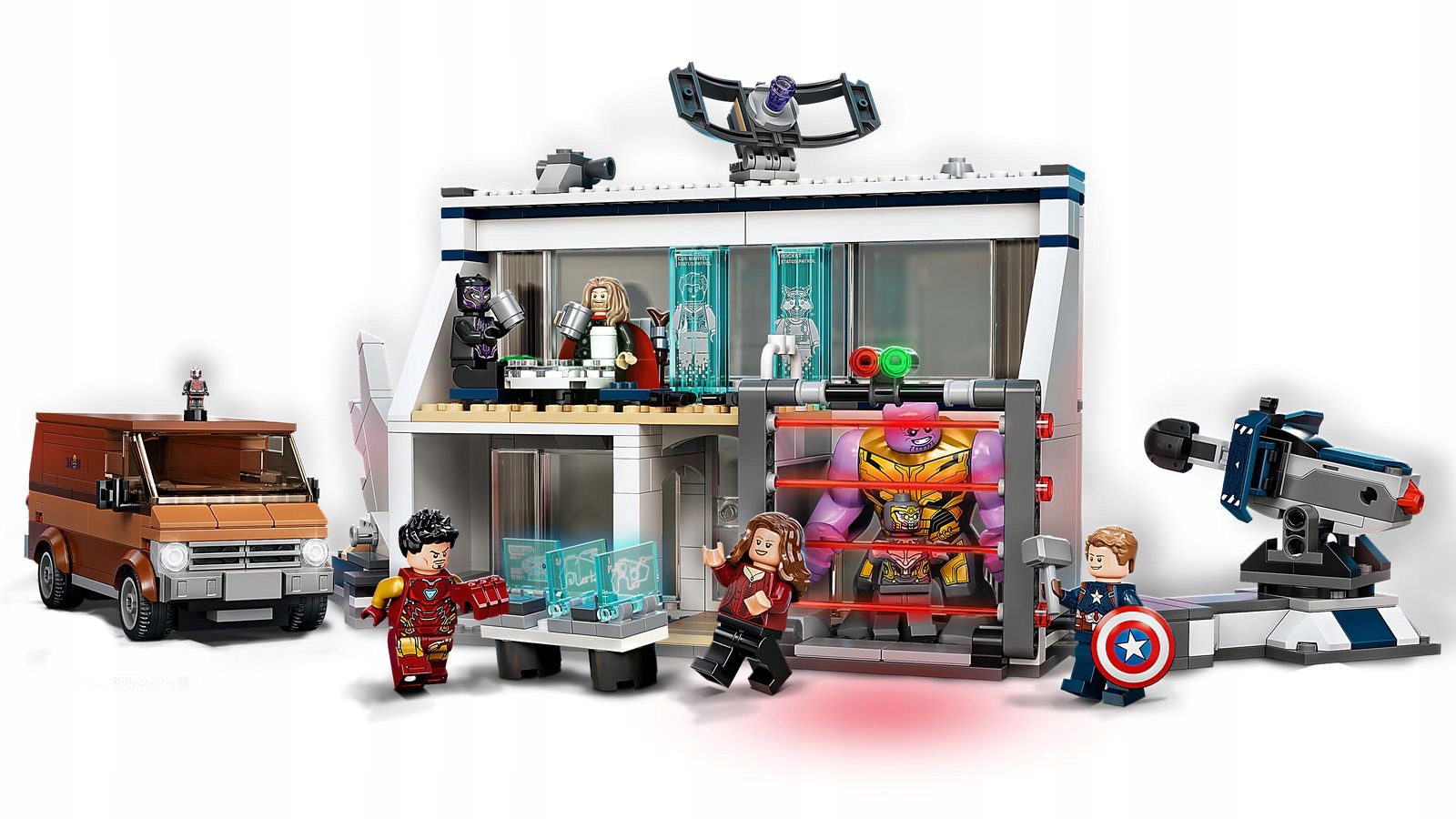 Dołącz do imponującej grupy postaci LEGO Marvel — Thora, Kapitana Ameryki, Czarnej Pantery, Iron Mana, Scarlet Witch, Ant-Mana, Thanosa i wojownika Centauri — i przeżyj niezliczone przygody z superbohaterami w kwaterze Avengersów. Zestaw ma mnóstwo funkcji, które inspirują dzieci do pomysłowej zabawy: laboratorium Iron Mana, w którym buduje on własną Rękawicę Nieskończoności; miejsce do spotkań i odpoczynku, w którym spotykają się superbohaterowie; celę więzienną oraz otwieraną furgonetkę, w której znajduje się wehikuł czasu.