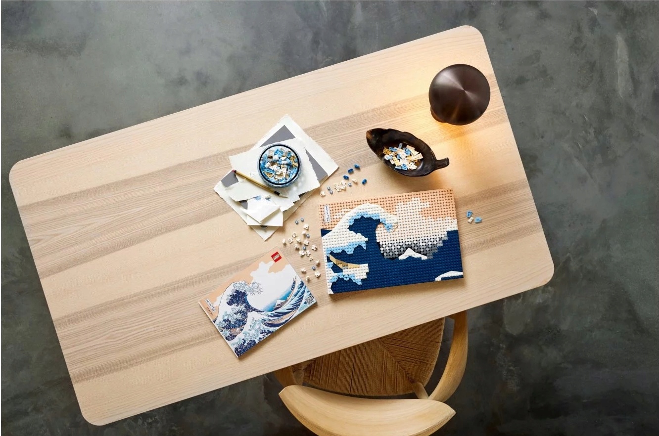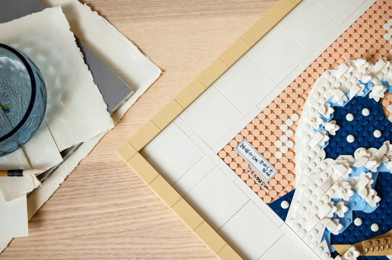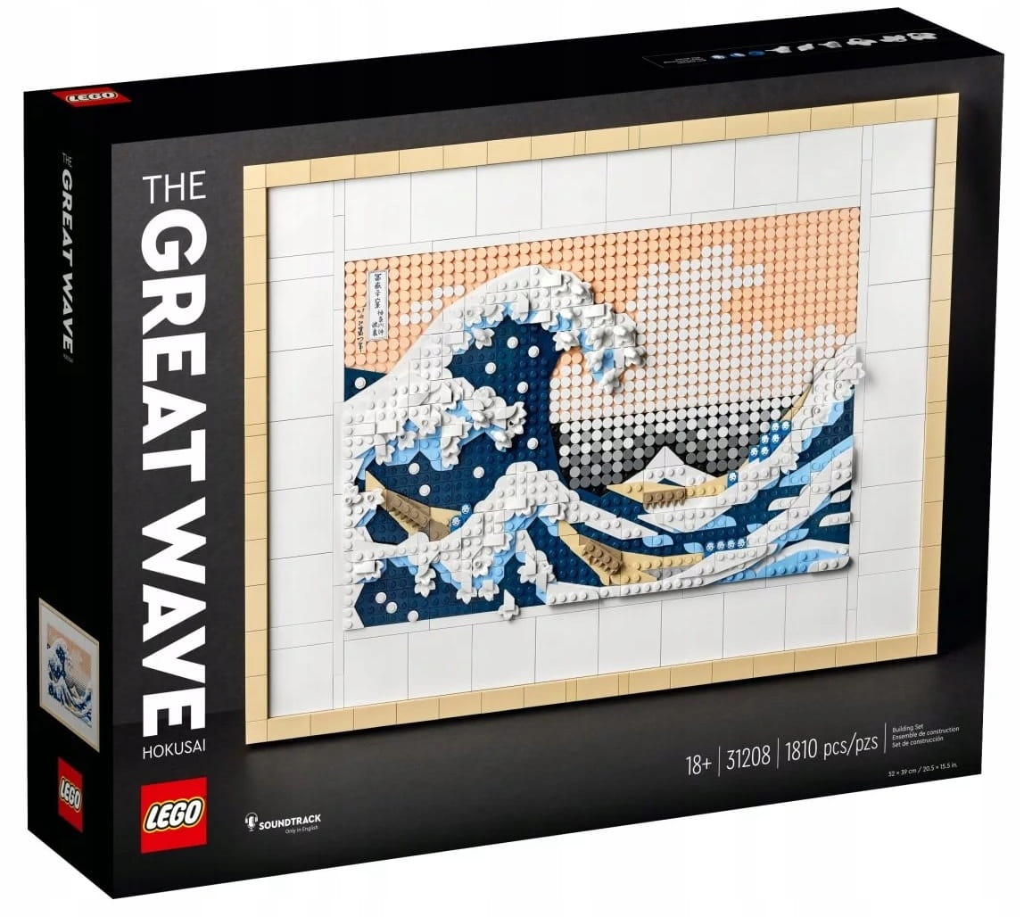 - Wspaniała ozdoba – model LEGO® dla dorosłych zawierający 1810 elementów, w tym sześć płytek w formie płótna, dwa wieszaki, rozdzielacz klocków i dekoracyjną płytkę z podpisem Hokusaia