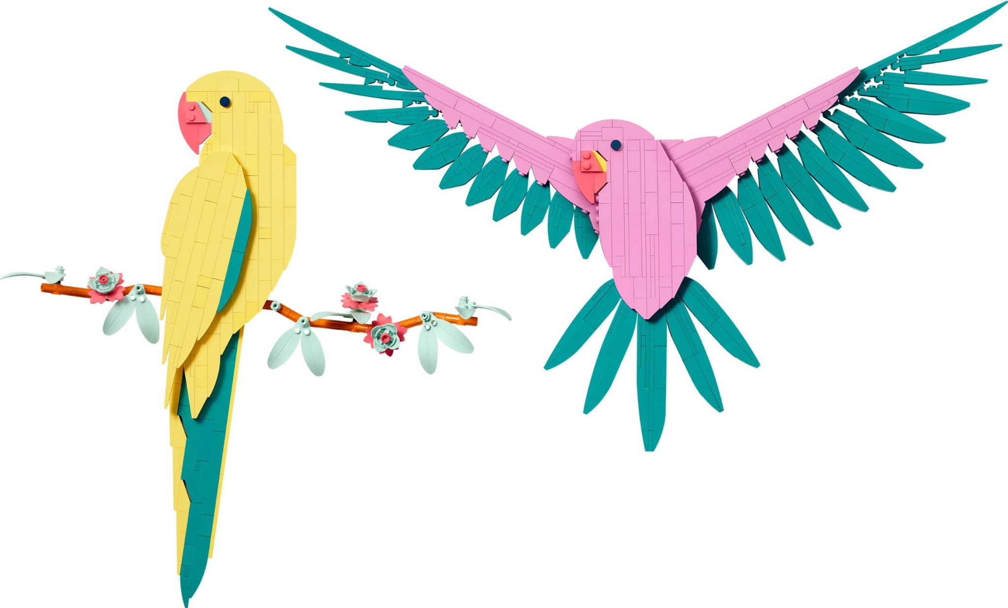 - Wymiary — ten 644-elementowy zestaw obejmuje żółtą papugę, która ma 40 cm wysokości, i różową papugę, która ma 35 cm wysokości.