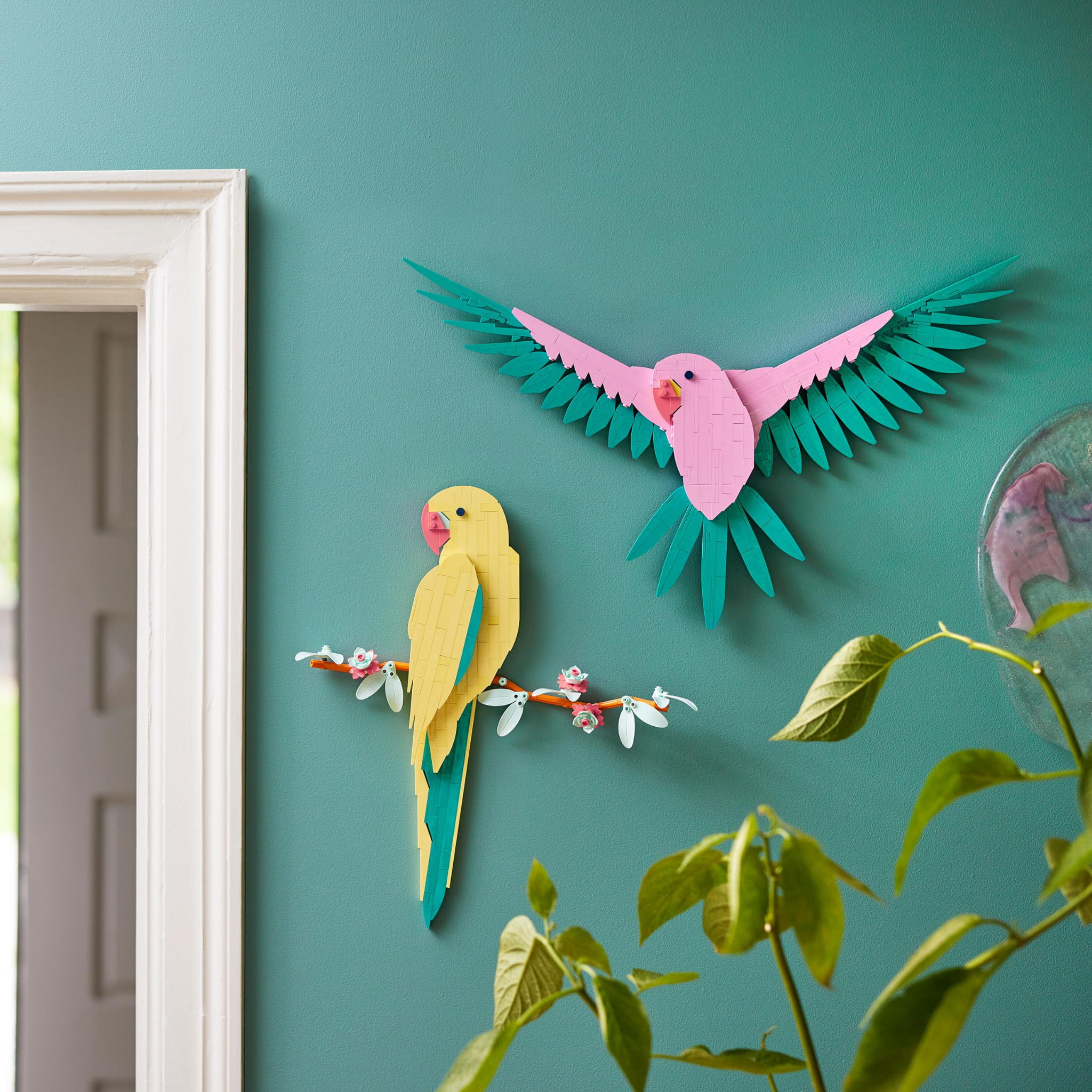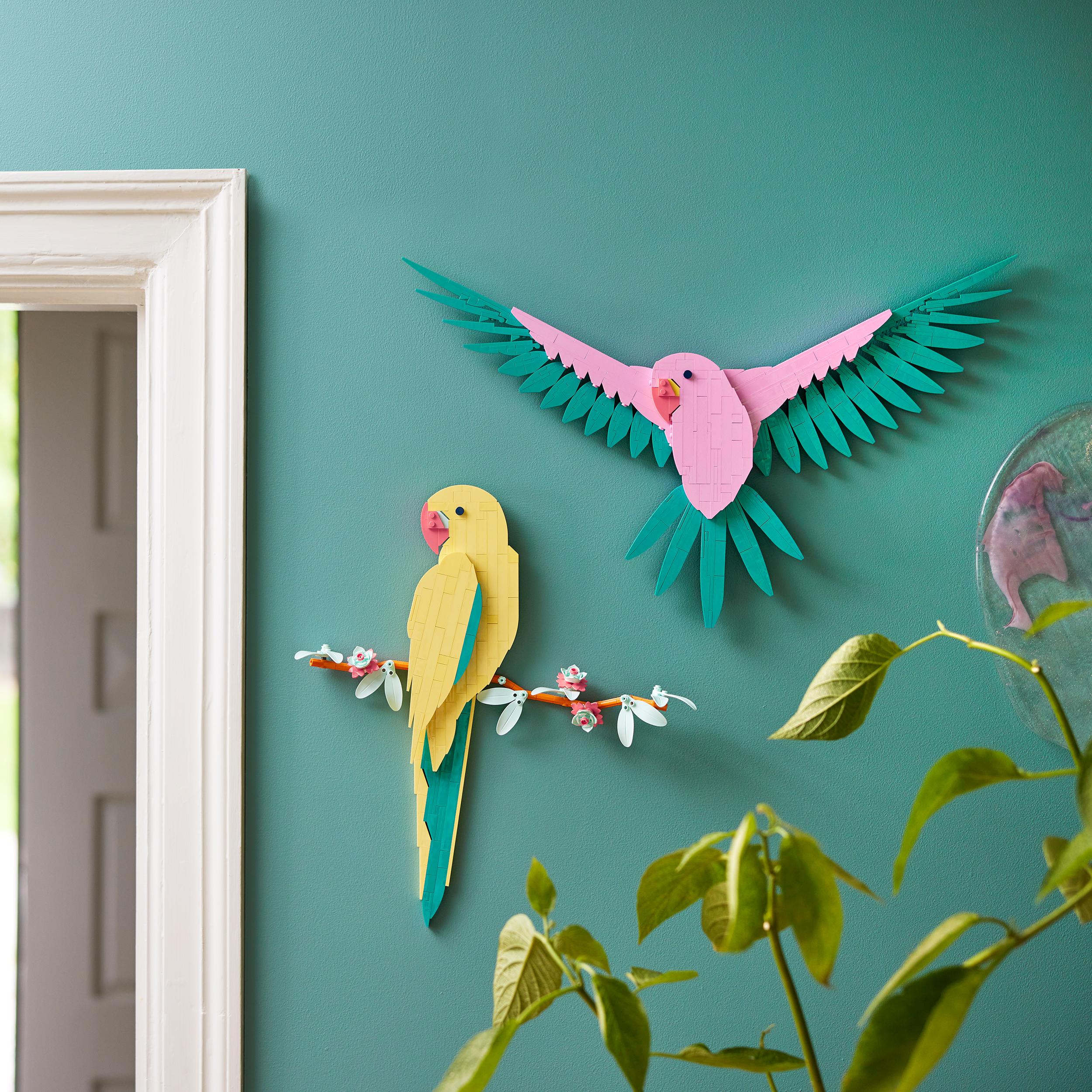 - Grafika na ścianę — użyj 644 klocków LEGO® z zestawu i stwórz kolorową scenę z dwiema arami: jedną siedzącą na kwitnącej gałęzi, a drugą w locie z rozpostartymi skrzydłami