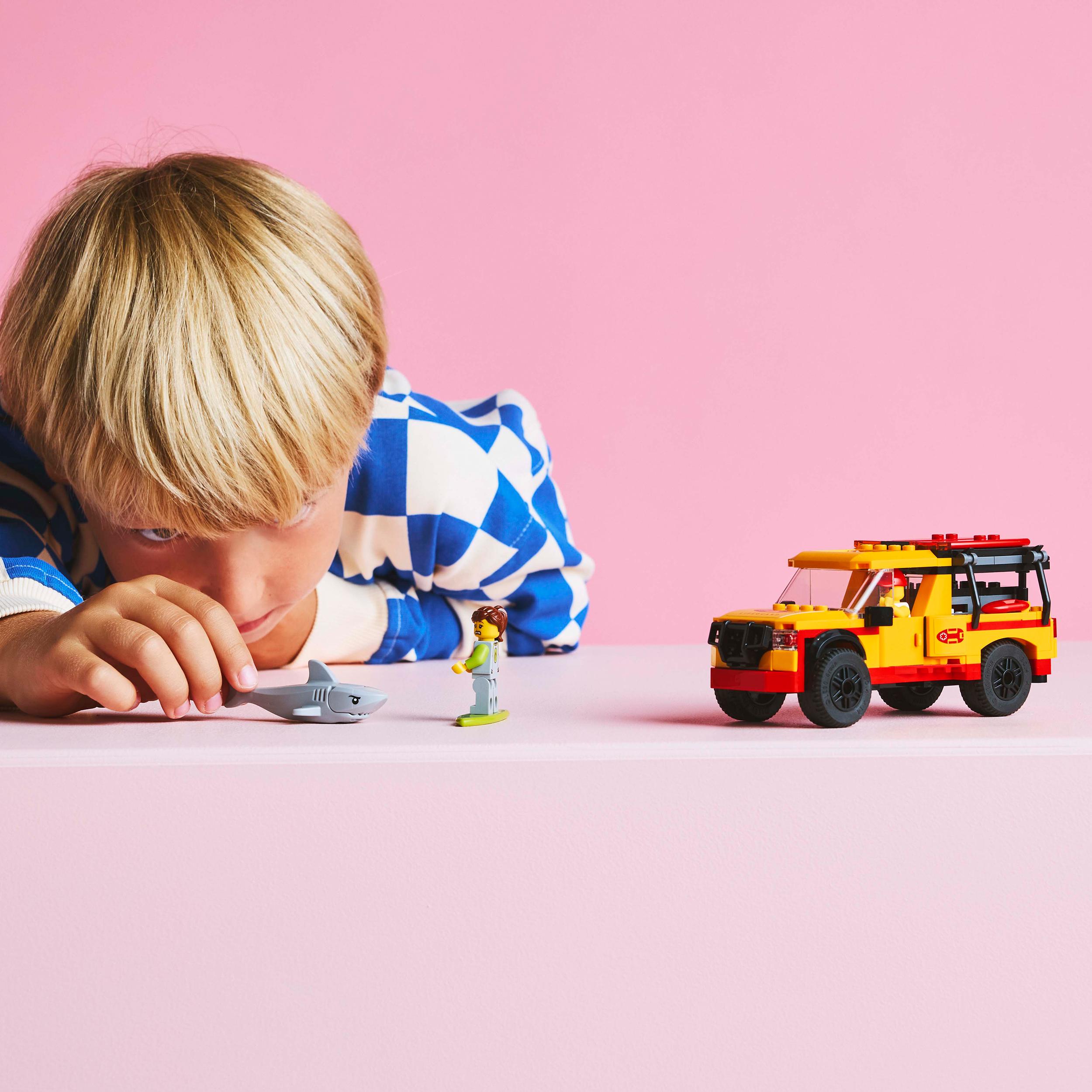 - Zestaw z pojazdem ratunkowym — dzięki zestawowi LEGO® City Furgonetka ratowników plażowych dzieci w wieku od sześciu lat mogą zanurzyć się w pełnych akcji nadmorskich przygodach