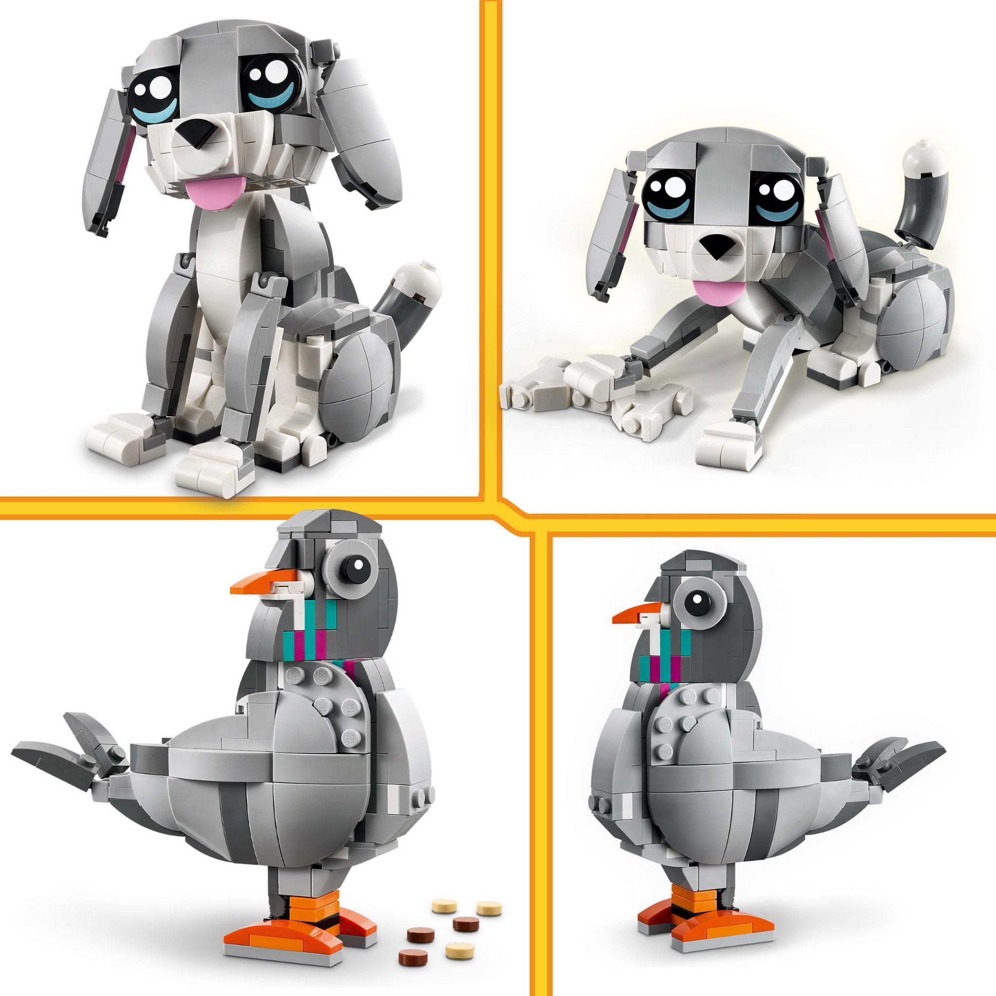 - Nieograniczone możliwości zabawy — dzieci mogą wymyślać ekscytujące przygody z trzema różnymi figurkami: psotnym kotem, wesołym psem i ciekawskim gołębiem (modeli nie można zbudować jednocześnie)