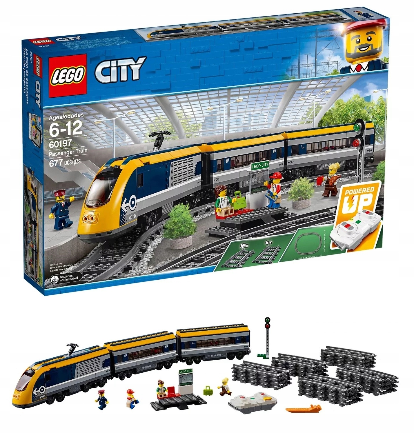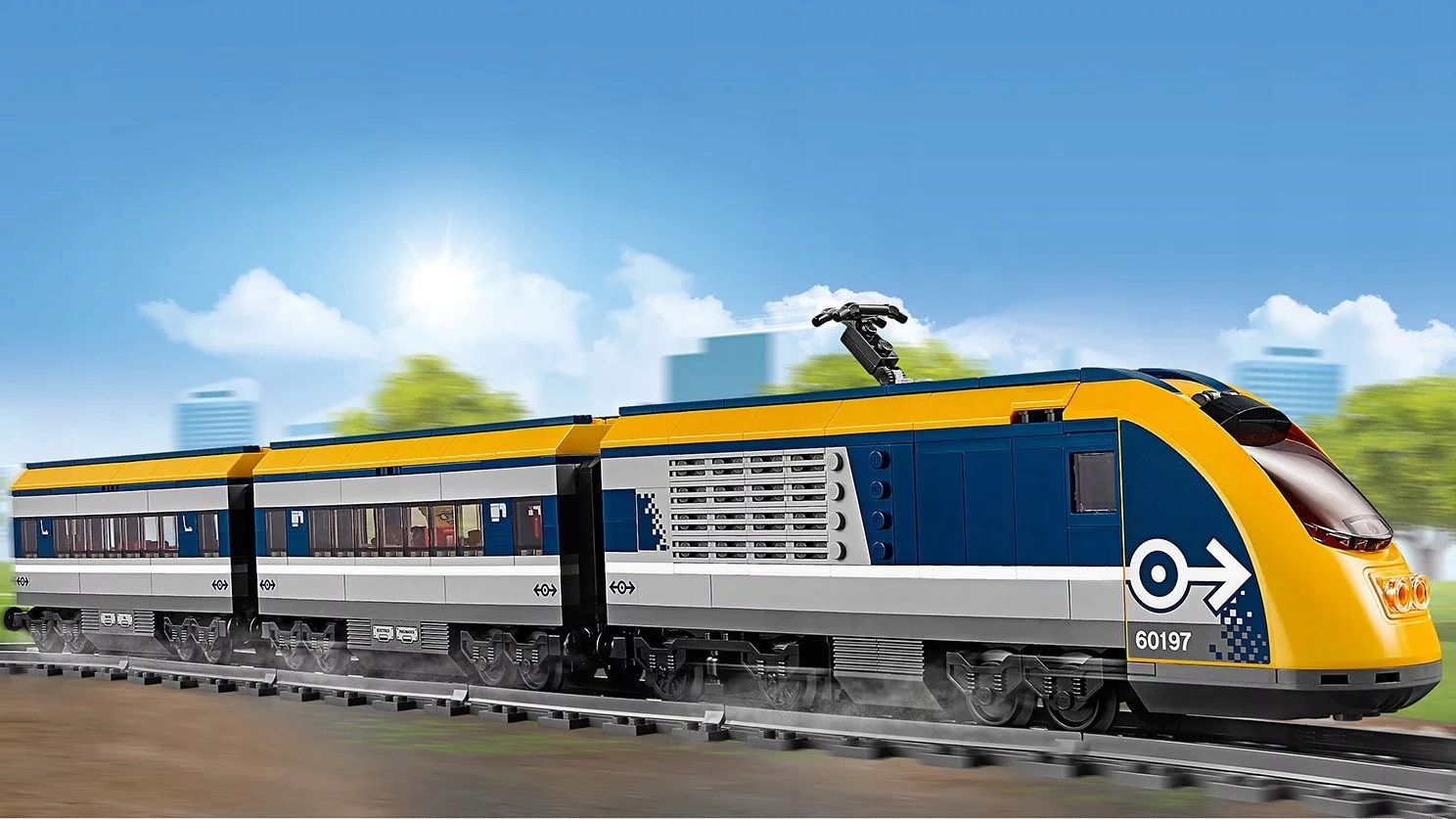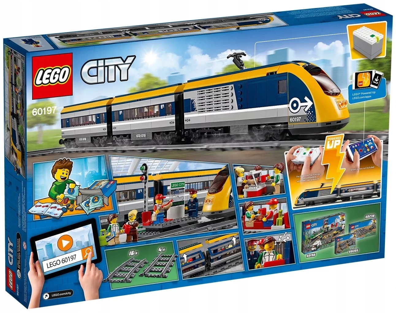 Wsiądź do pociągu z zestawu LEGO® City 60197 Pociąg pasażerski! Ten ciekawy pojazd wyposażony jest w silnik z 10-biegowym pilotem Bluetooth i otwieranym „nosem”, kabinę maszynisty z otwieranym oknem oraz dwa wagony z siedzeniami, stolikami i zdejmowanymi dachami.
