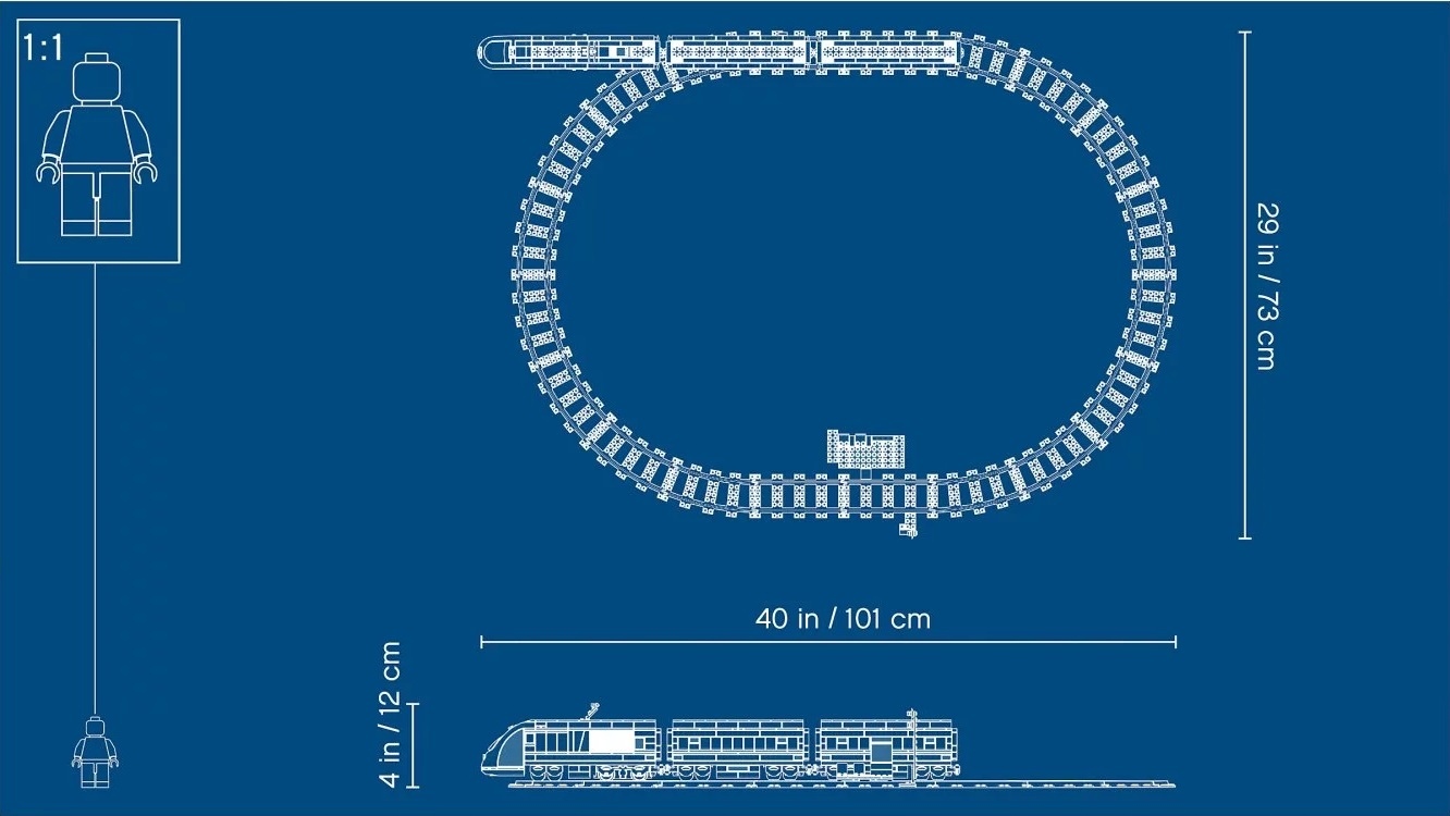 W zestawie jest także okrągły tor składający się z 16 zakrzywionych i 4 prostych fragmentów, peron do zbudowania z dwoma siedzeniami i mapą połączeń kolejowych, sygnalizacja kolejowa oraz cztery minifigurki LEGO.
