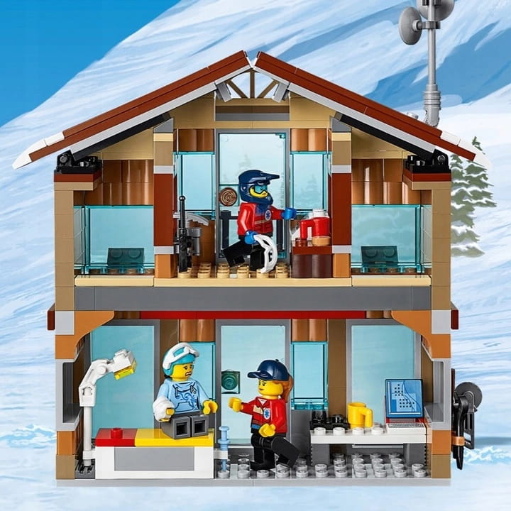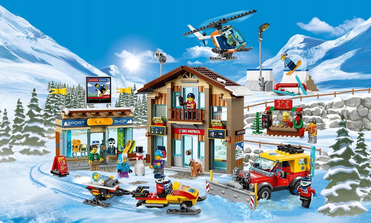 - Ten pełen atrakcji zestaw konstrukcyjny przedstawia piętrową bazę ratunkową z antenami komunikacyjnymi na dachu, sklep narciarski z dużym ekranem telewizyjnym i stojakami na deski snowboardowe oraz narty, stoisko z ciepłymi napojami i babeczkami oraz wspaniały snowpark z masztem oświetleniowym, rampą typu half-pipe ze schodkami oraz osobną rampą typu grind rail.