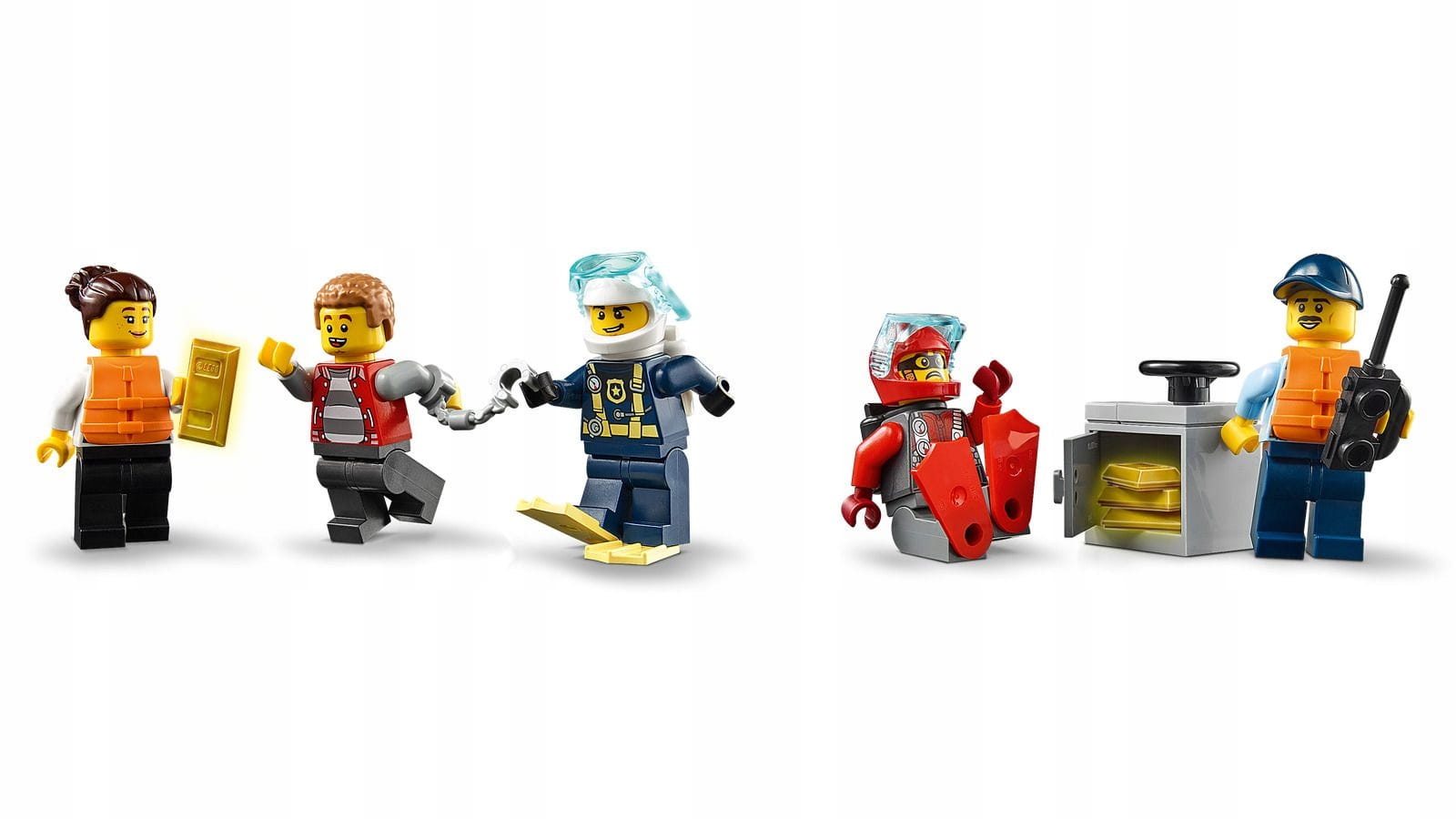 - W zestawie akcesoria LEGO®: sejf bankowy z klockami udającymi sztabki złota i sprzęt dla policyjnego płetwonurka.