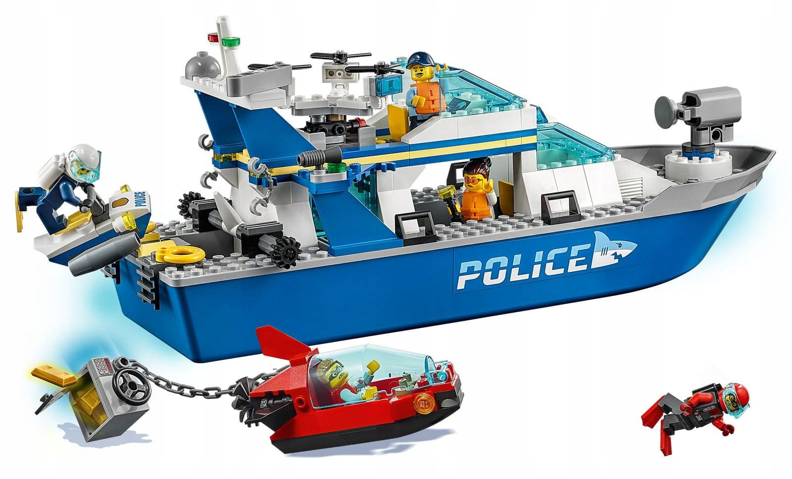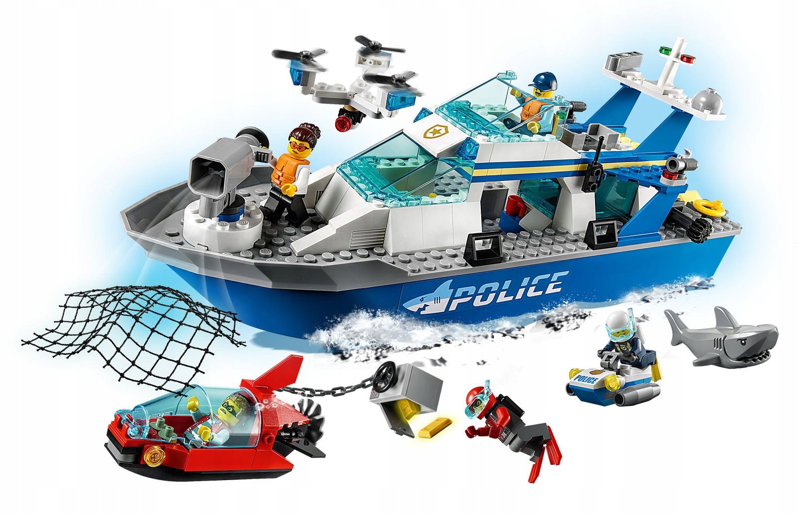 Takimi jak szczegółowe stanowisko kontroli i dron obserwacyjny. Za pomocą dźwigni dzieci mogą zwodować nurka ze skuterem i wystrzelić siatkę, w którą zaplącze się łódź podwodna złodziejaszków. W zestawie nie brakuje inspiracji do wcielania się w różne postacie: jest tam pięć minifigurek, w tym Gracie Goodhart, Frankie Lupelli i Hacksaw Hank z serialu telewizyjnego LEGO City Adventures.
