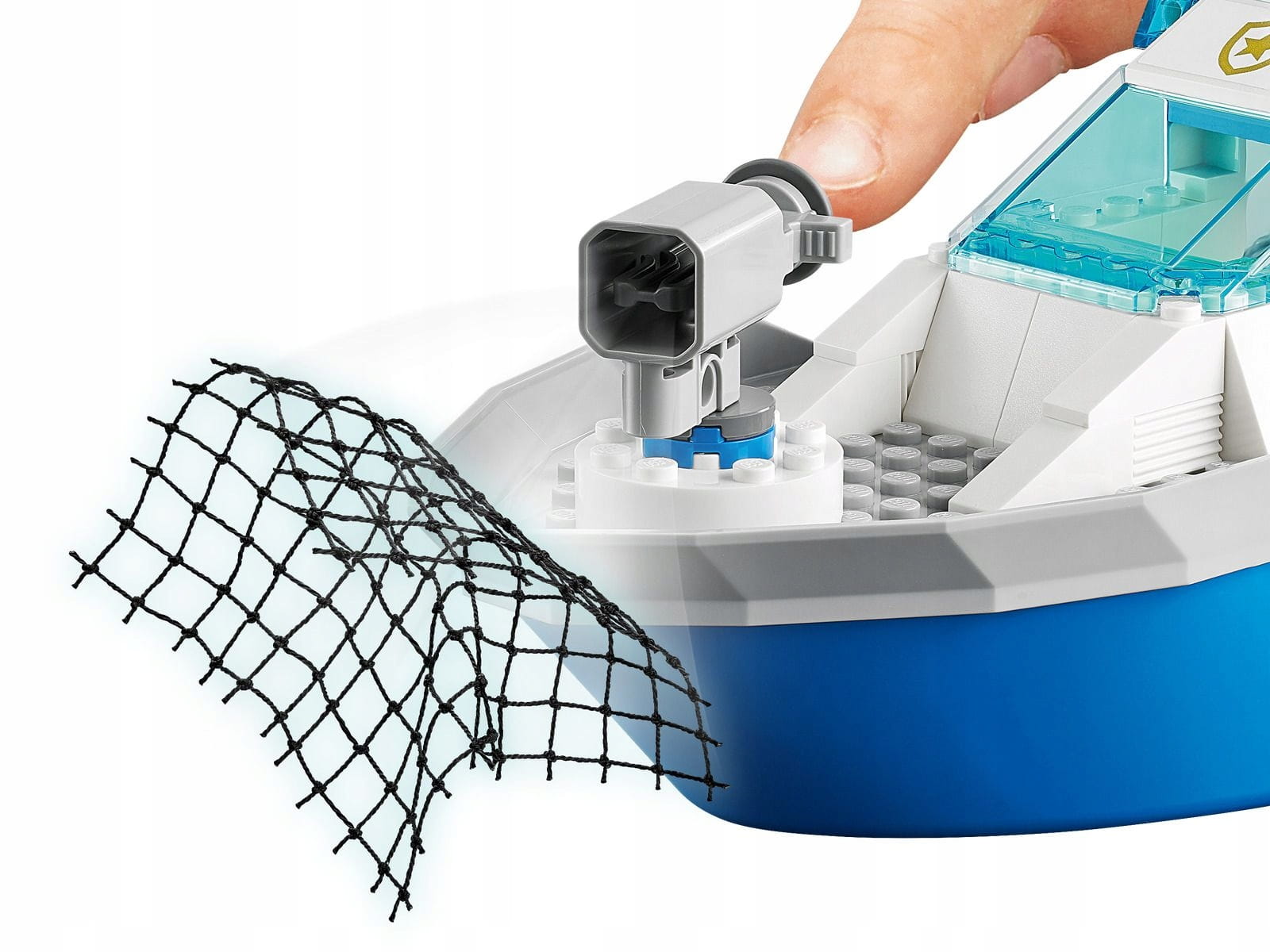 - Łódź unosi się na wodzie, pozwala złapać złodziejaszków w wystrzeliwaną sieć i ma dźwignię do wodowania skutera dla płetwonurka, więc dzieci na pewno wymyślą niejedną historię z minifigurkami postaci z serialu LEGO® City.