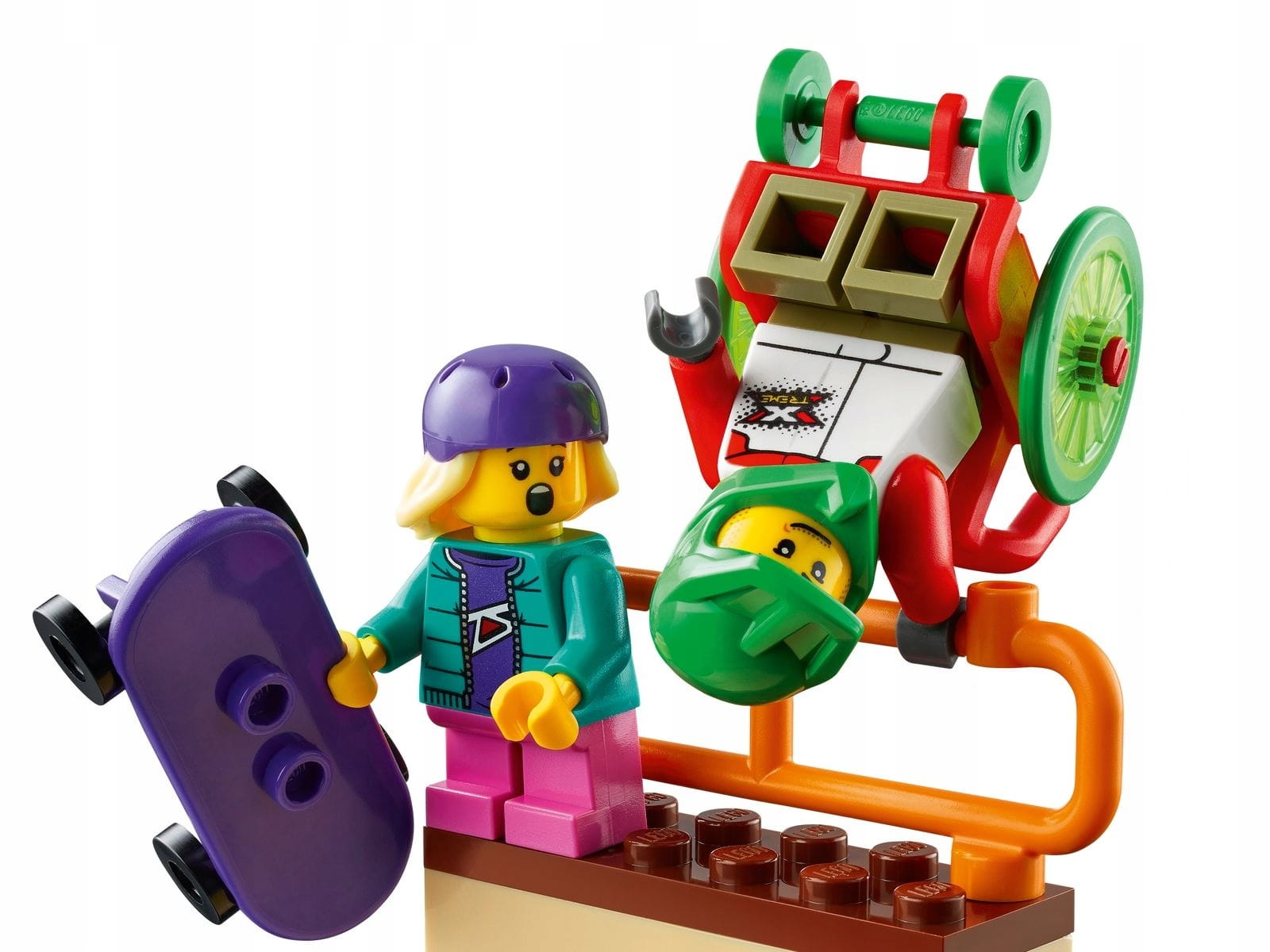 - Co jest w pudełku? Dzieci znajdą tam wszystkie elementy do zbudowania zabawkowego skateparku, w tym płytkę drogową LEGO®, zapory, flagi, rampy i huśtawkę, a do tego minifigurki: rowerzystę z BMX-em, sportowca na wózku i skatera.