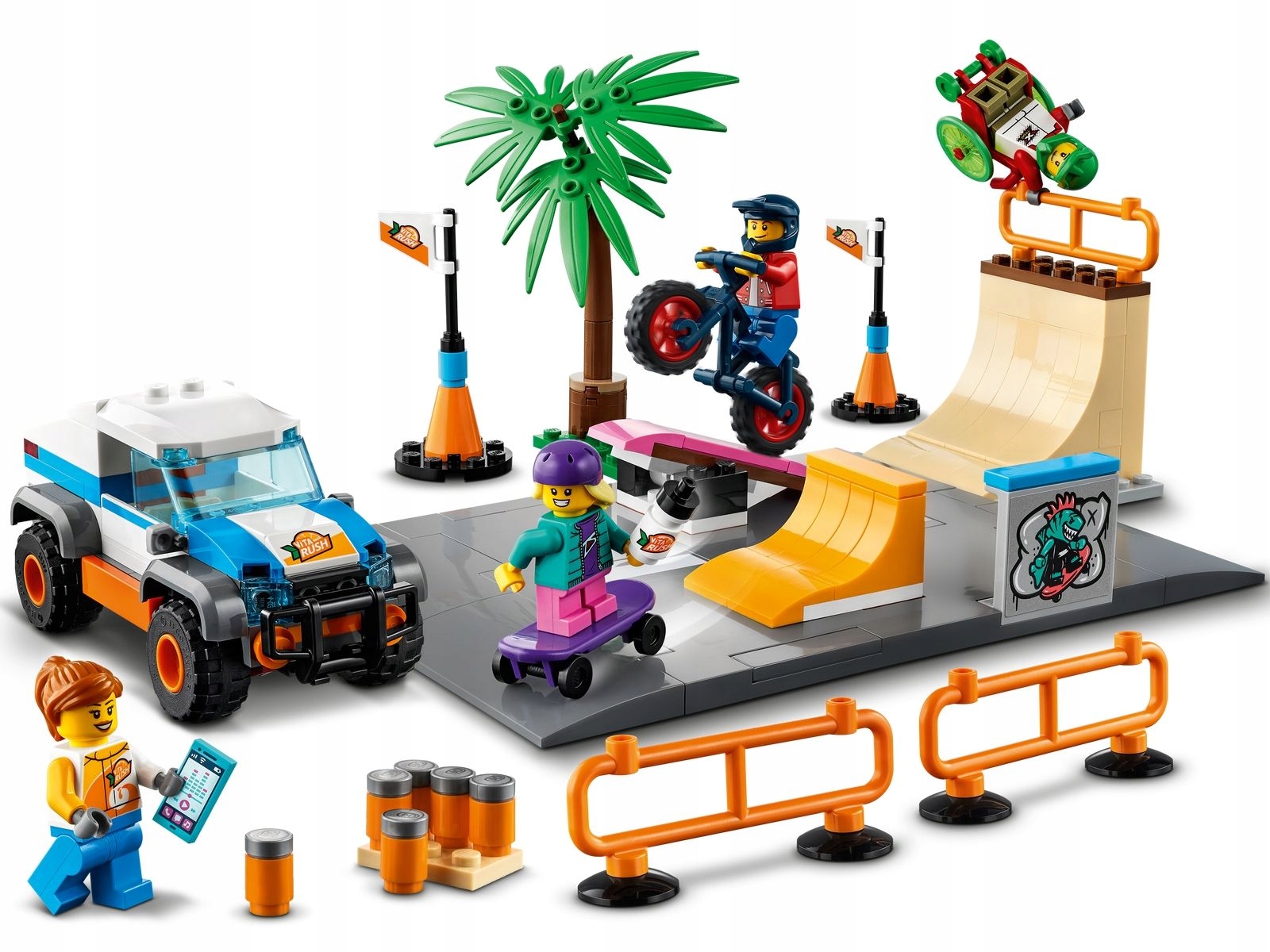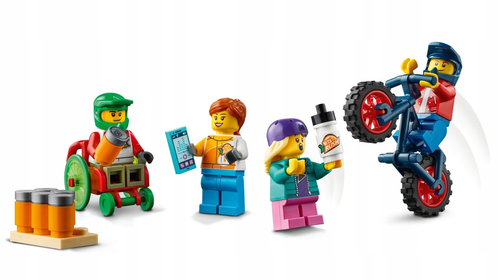 - W zestawie są też akcesoria LEGO®: kaski dla minifigurek skaterów, telefon komórkowy i elementy napojów Vita Rush.