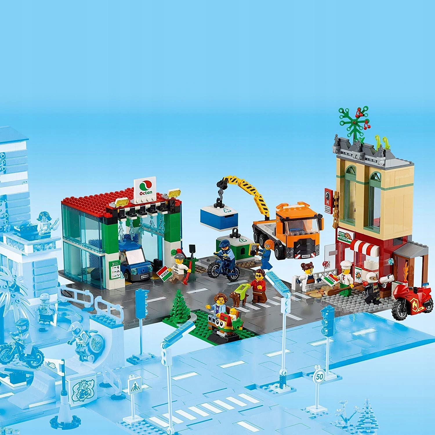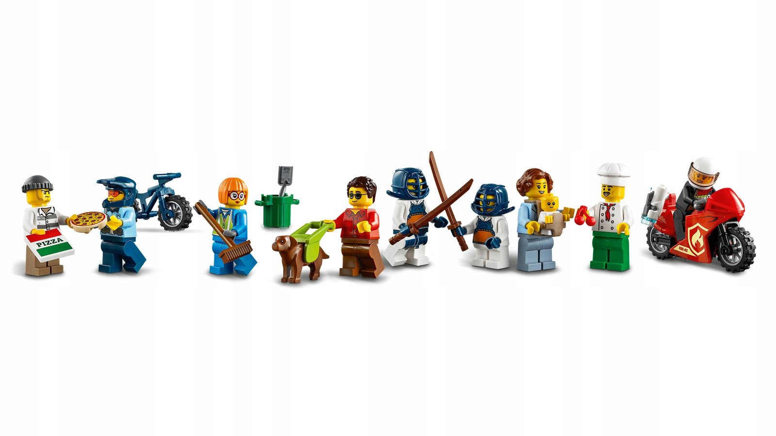 - Są tu płytki ulicy LEGO® oraz wszystkie klocki potrzebne do zbudowania pizzerii, myjni, sali treningowej, parku, stacji recyklingu, ciężarówki, samochodu elektrycznego, motocykla i roweru. Do tego osiem minifigurek, dziecko i pies przewodnik.