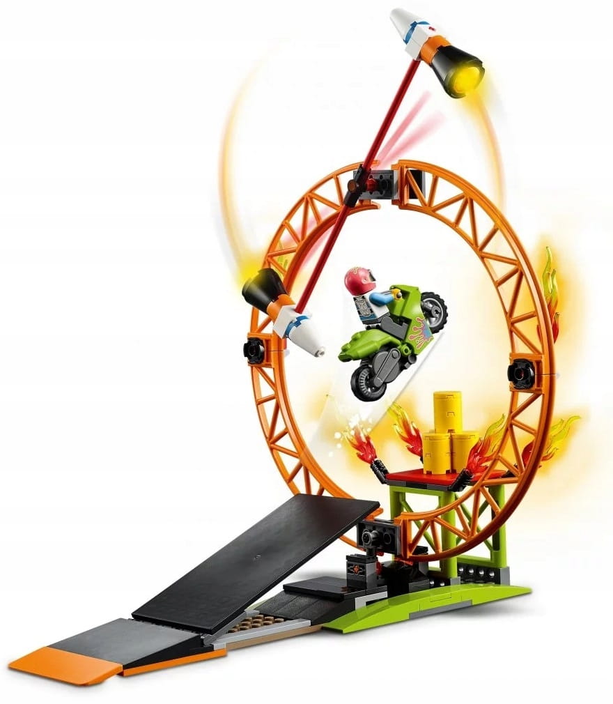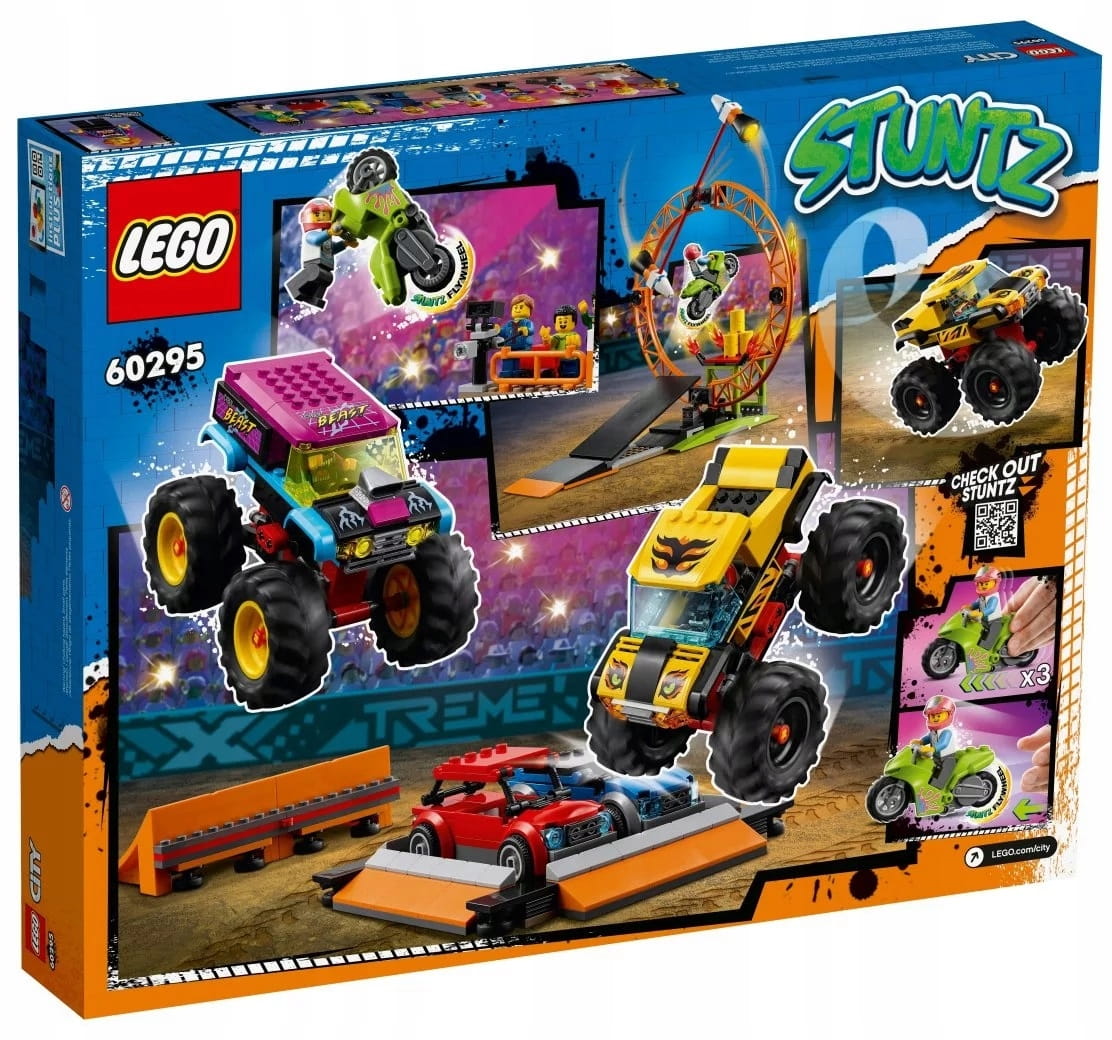 Zestaw LEGO® City Arena pokazów kaskaderskich (60295) zawiera motocykl napędzany kołem zamachowym oraz rekwizyty do fantastycznego pokazu kaskaderów. Dzieci mogą przeskoczyć motocyklem kaskaderskim przez płonącą obręcz, wykonać salto do tyłu i inne sztuczki dwoma świetnymi monster truckami i z łatwością przestawić moduły kaskaderskie, by przygotować inny pokaz. W komplecie jest też sześć minifigurek, w tym trzy postacie z serialu telewizyjnego LEGO City.
