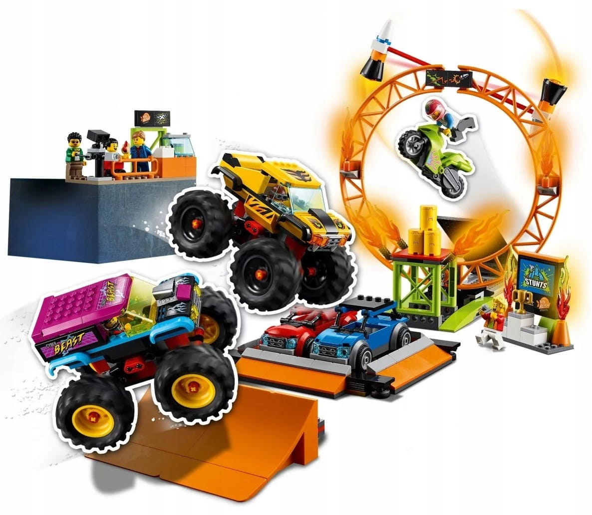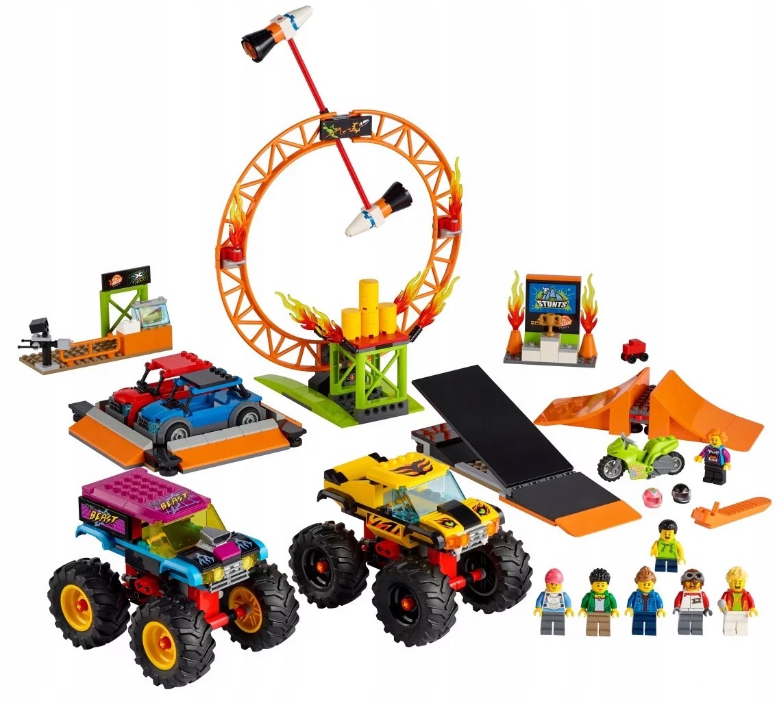- Co jest w środku? Wszystkie elementy dwóch monster trucków, dwóch aut z dachami do niszczenia, płonącej obręczy, ramp do skakania, motocykla kaskaderskiego napędzanego kołem zamachowym, stoiska z hot dogami i podium oraz sześć minifigurek.