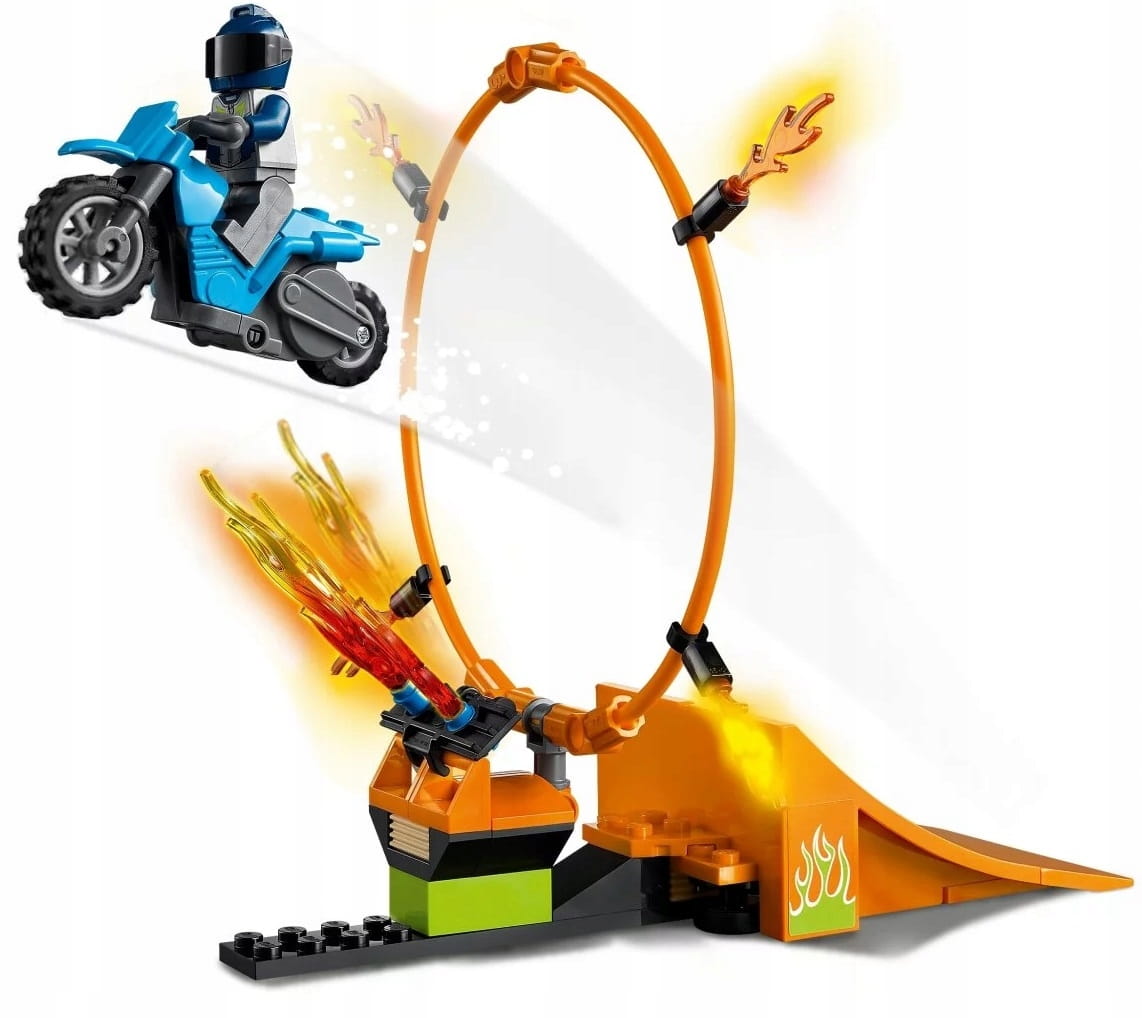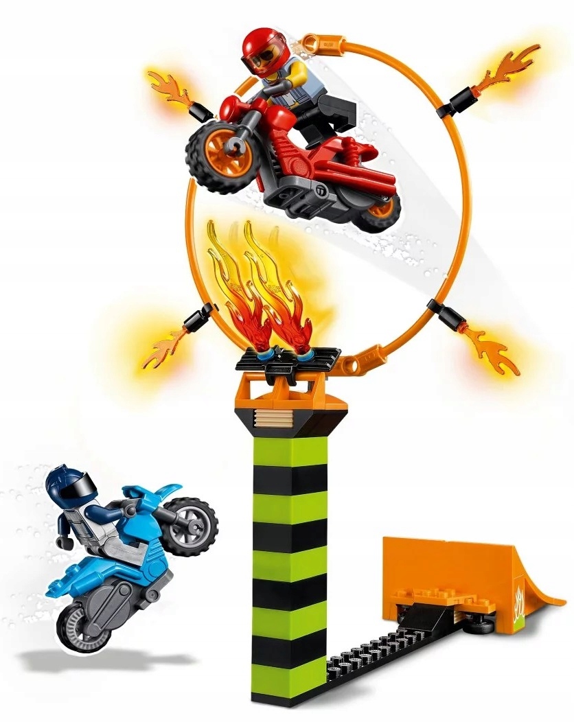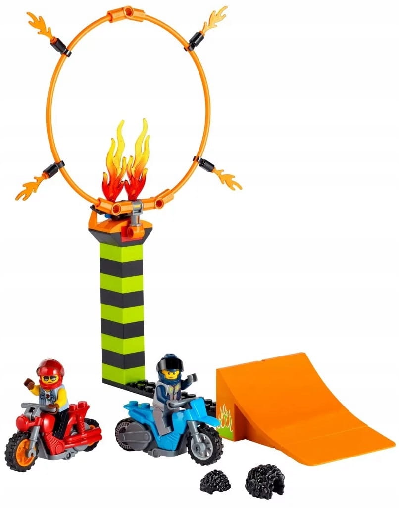 - Co jest w środku? Płonąca obręcz, wieża z regulowaną wysokością, płomienie LEGO® do zbudowania, dwa motocykle kaskaderskie napędzane kołem zamachowym oraz dwie minifigurki motocyklistów, w tym Duke DeTain z serialu telewizyjnego LEGO City.