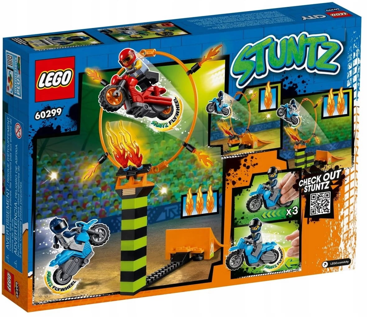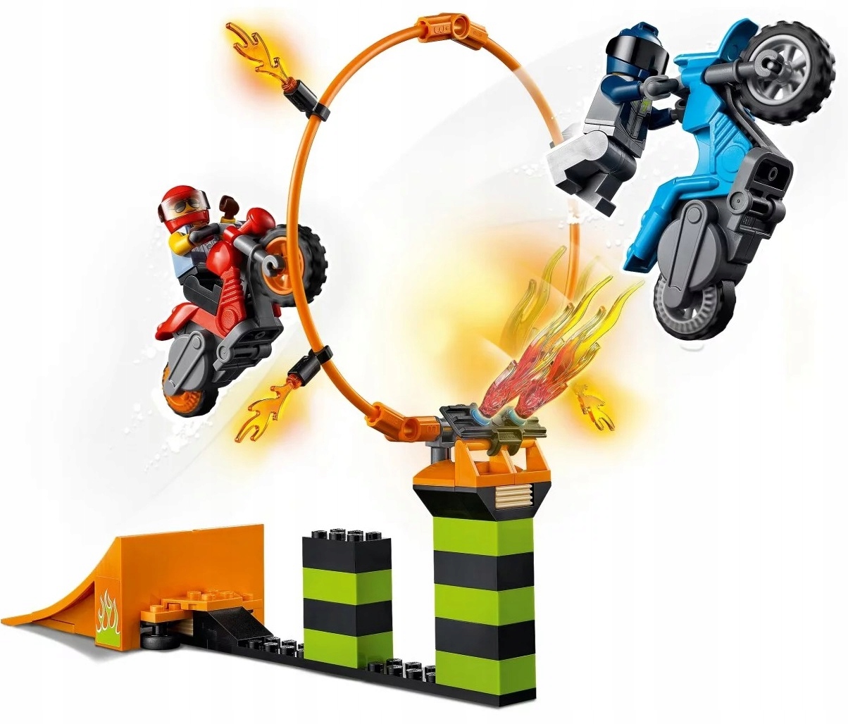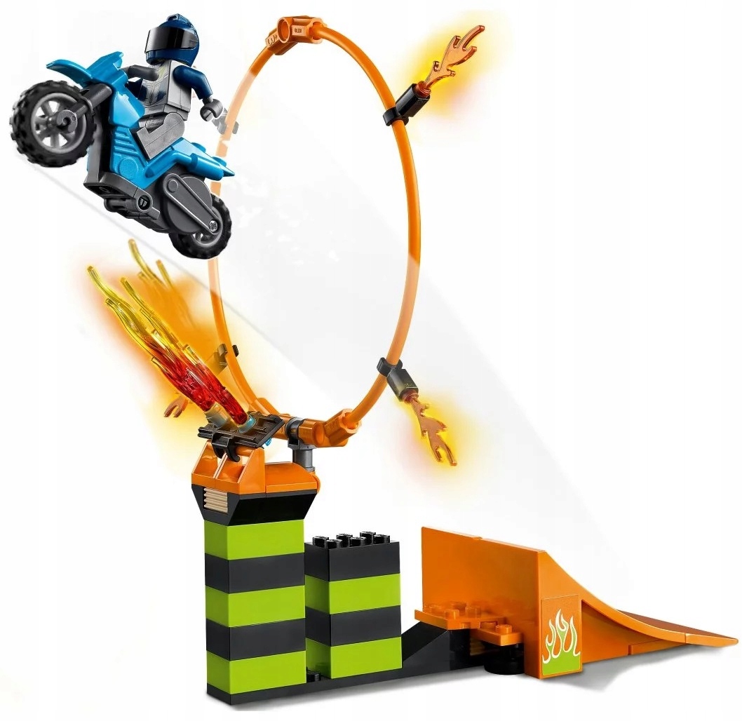 - Co jest w środku? Płonąca obręcz, wieża z regulowaną wysokością, płomienie LEGO® do zbudowania, dwa motocykle kaskaderskie napędzane kołem zamachowym oraz dwie minifigurki motocyklistów, w tym Duke DeTain z serialu telewizyjnego LEGO City.