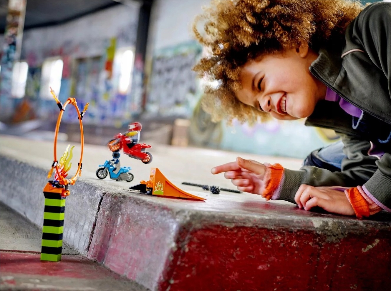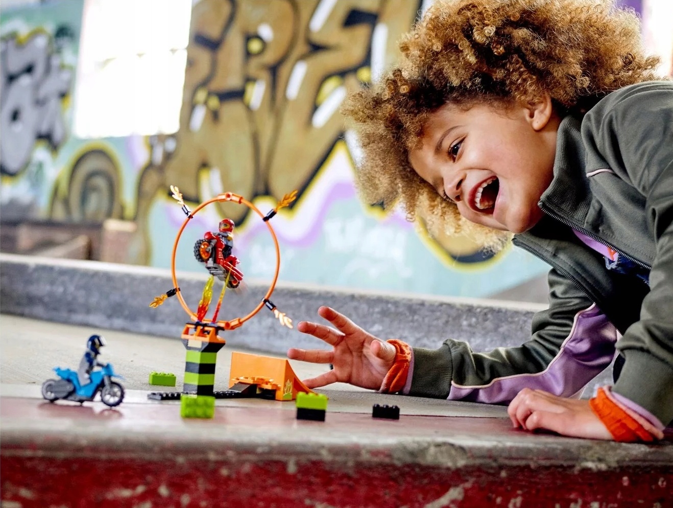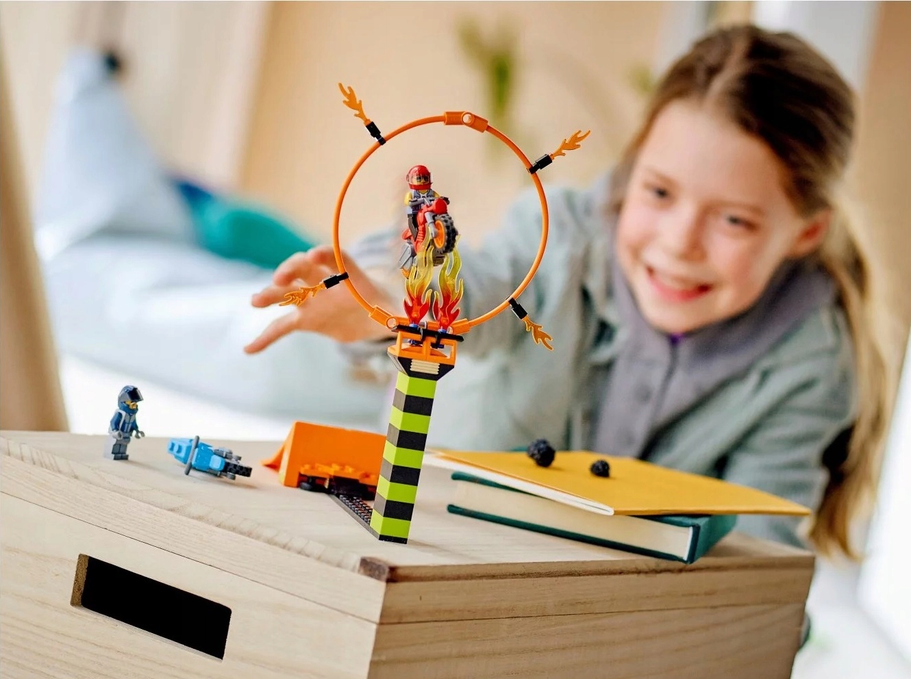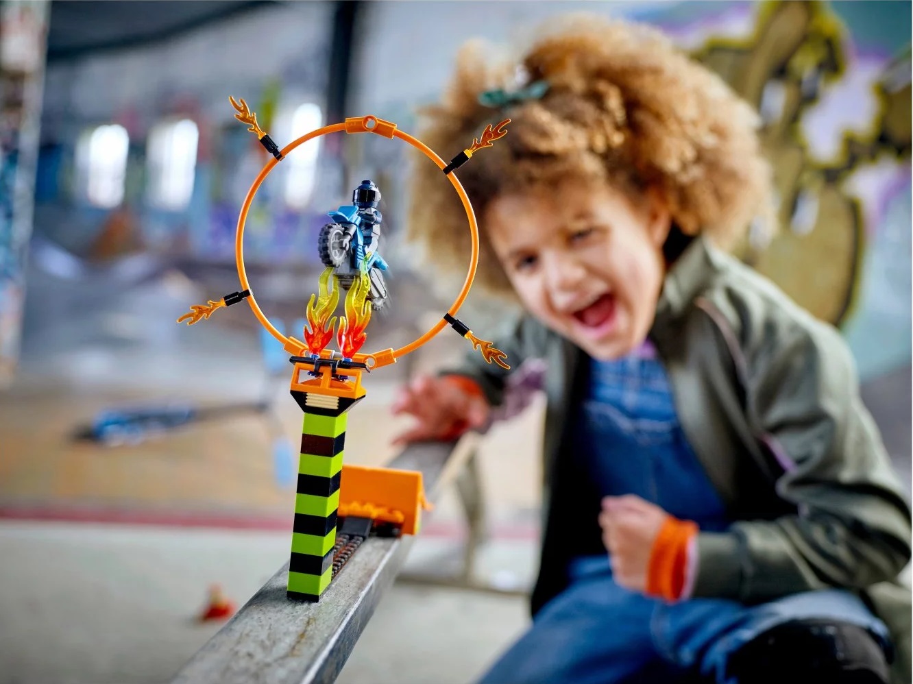 - Dzieci mogą uruchomić motocykle kaskaderskie napędzane kołem zamachowym i wjechać po rampie, by przeskoczyć przez płonącą obręcz. Potem można wydłużyć skok i podnieść obręcz, by zwiększyć trudność akrobacji!