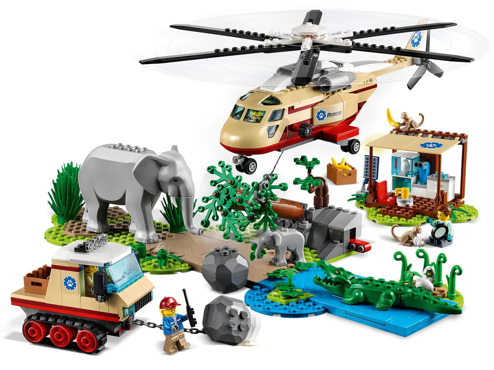 - Dzieci znajdą tu wszystko, czego potrzeba do zbudowania helikoptera z wyciągarką, pojazdu gąsienicowego, kliniki weterynaryjnej, scenerii sawanny z funkcją osuwiska, a także figurki słonia, słoniątka i węża, dwie figurki małp i cztery minifigurki.