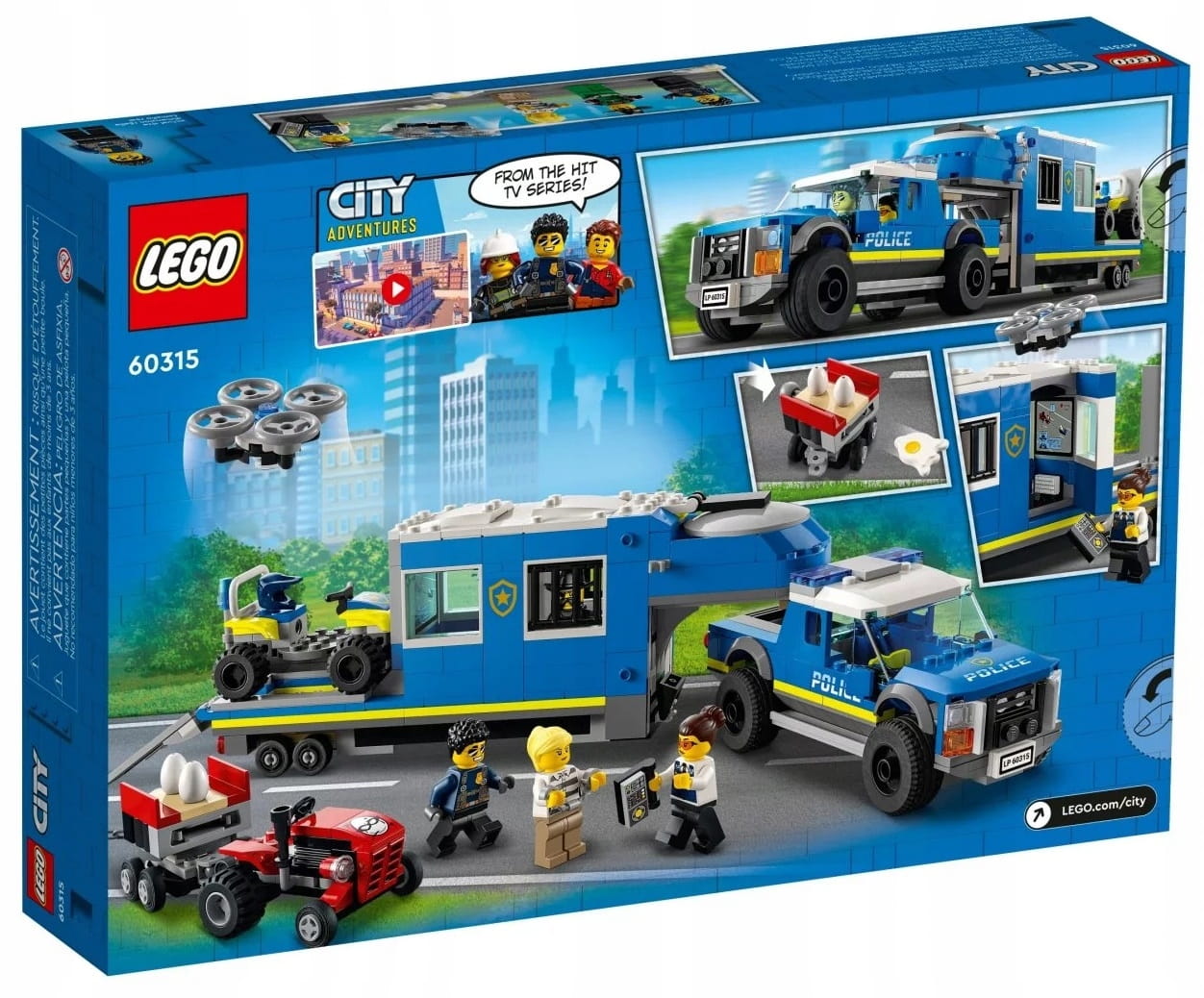 - Zestaw policyjny z serialu telewizyjnego LEGO® City — model LEGO City Mobilne centrum dowodzenia policji (60315) docenią wszyscy młodzi fani serialu telewizyjnego LEGO City Adventures