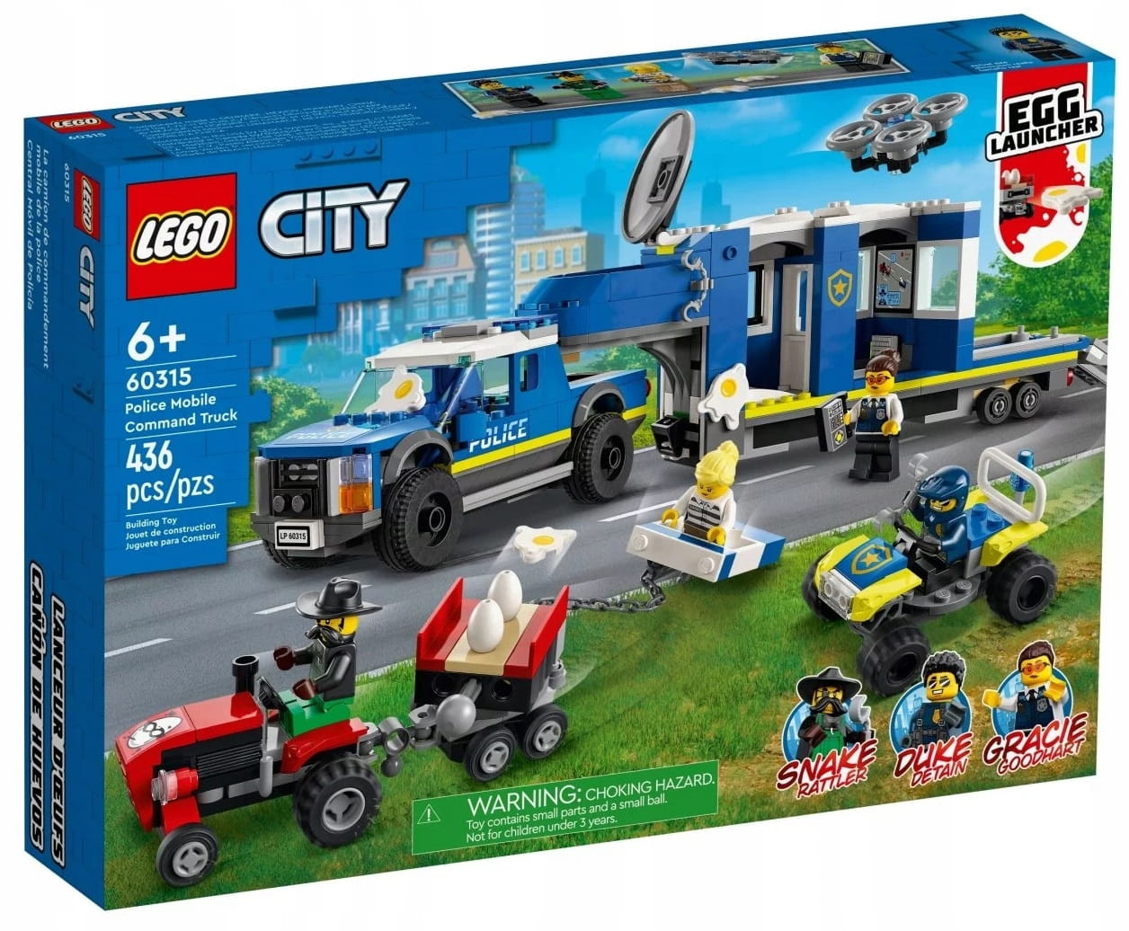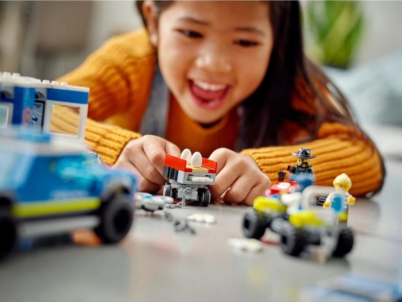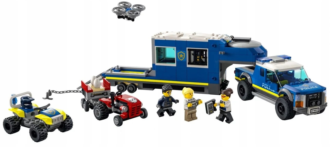 - Zawartość opakowania — w środku jest wszystko, czego dzieci potrzebują do zbudowania policyjnego pick-upa, przyczepy z aresztem, drona, quada i traktora z przyczepą, oraz cztery minifigurki, w tym trzy postacie z serialu telewizyjnego LEGO® City