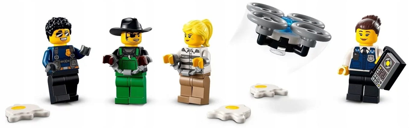 - W komplecie akcesoria dla minifigurek LEGO® — ten zestaw policyjny zawiera sporo fajnych akcesoriów do pomysłowej zabawy, takich jak pilot do zabawkowego drona, kajdanki i jajka