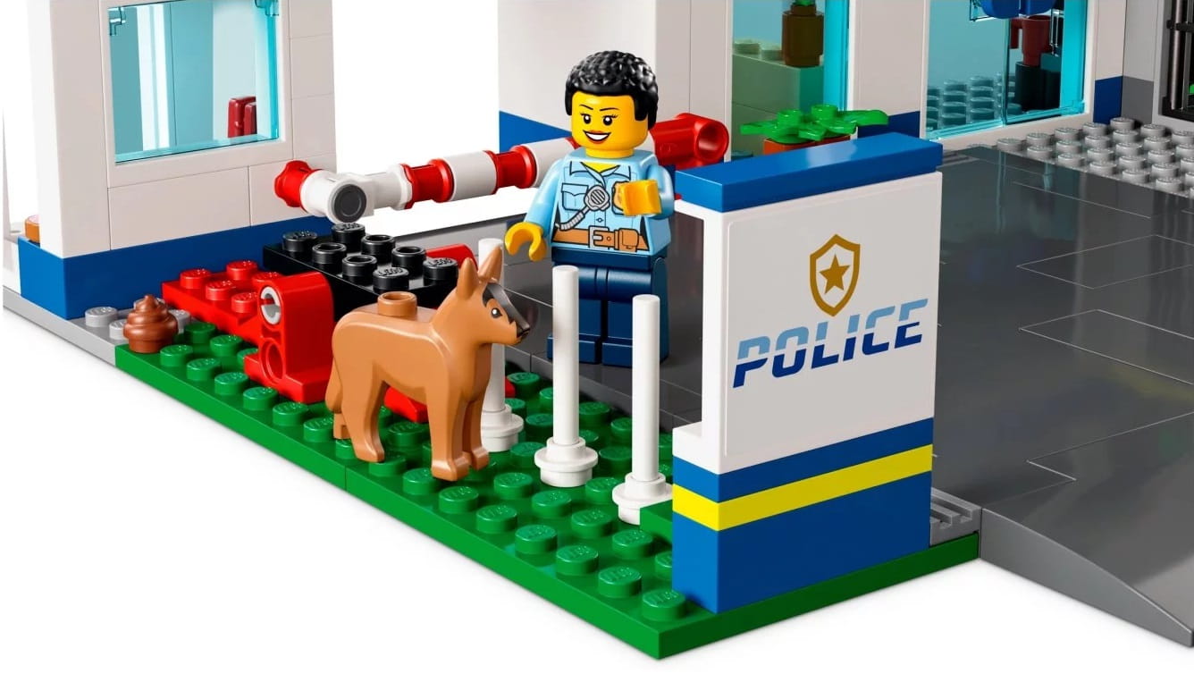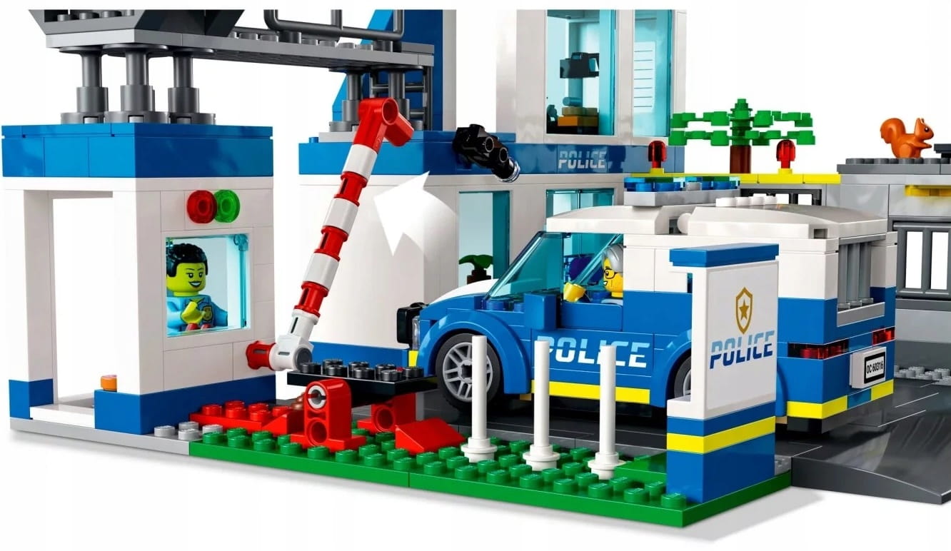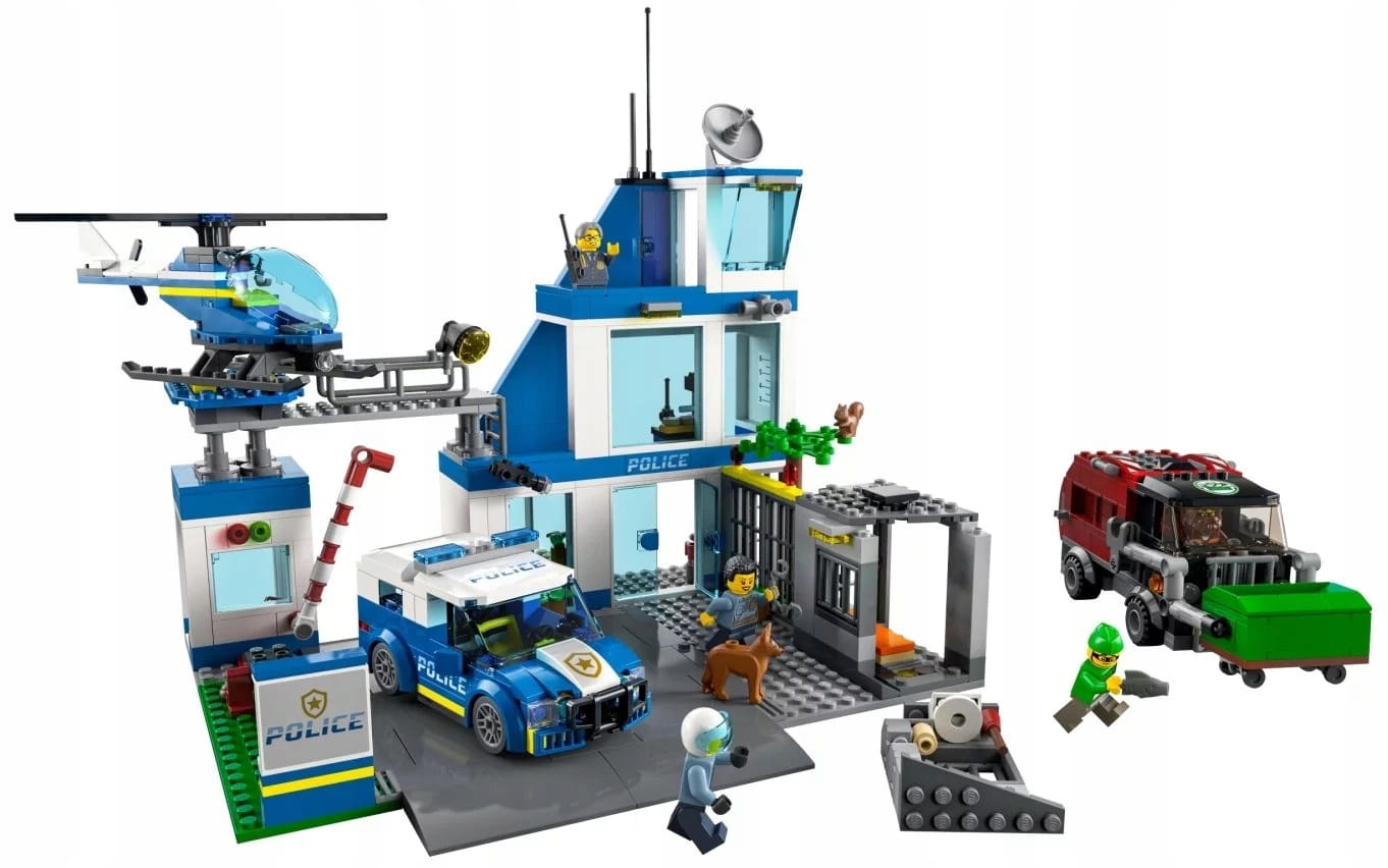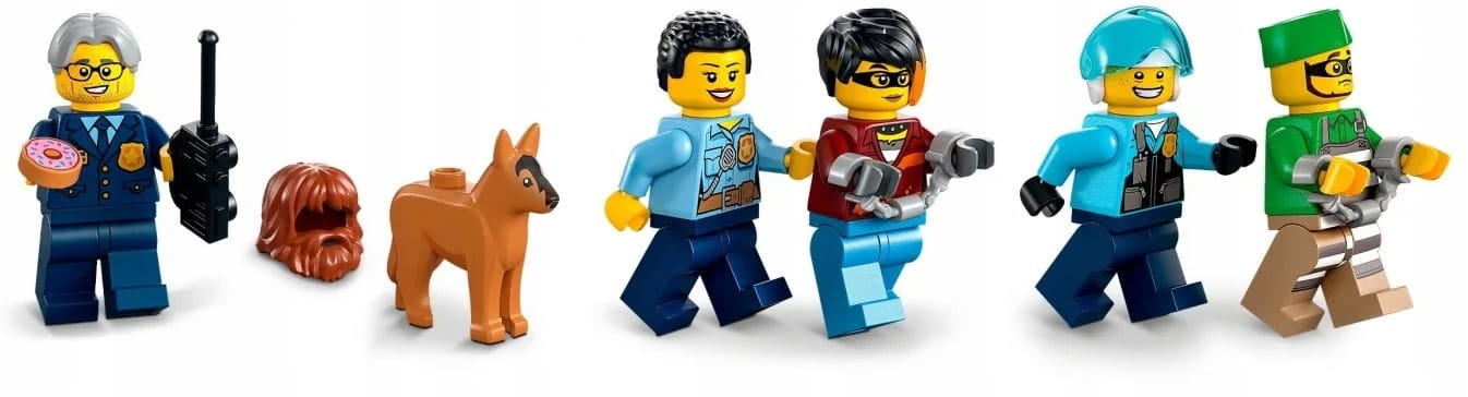 - Zawartość opakowania — w środku jest wszystko, czego dzieci potrzebują do zbudowania dwupiętrowego posterunku policji, pojazdu patrolowego, helikoptera i śmieciarki, oraz figurka psa i pięć minifigurek, w tym trzy postacie z serialu LEGO® City