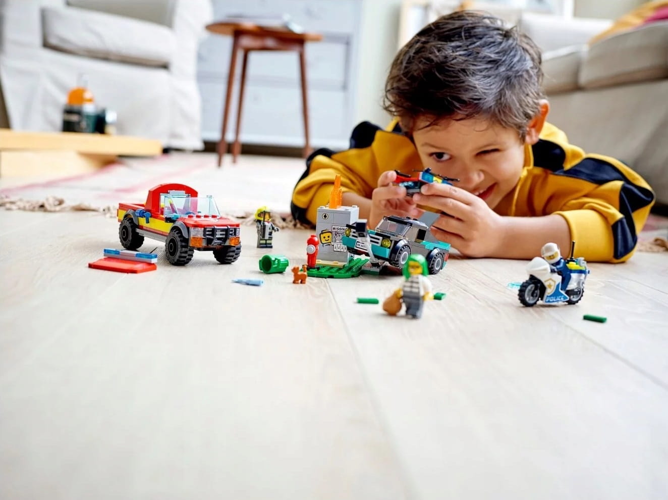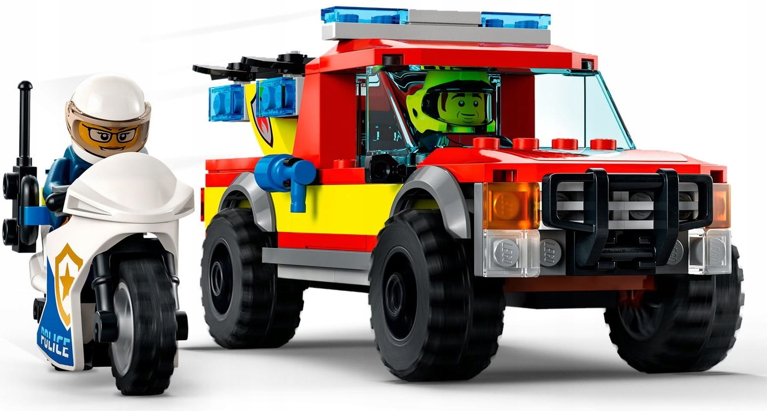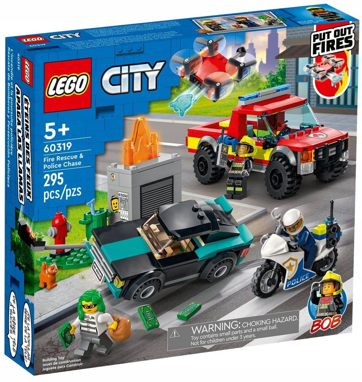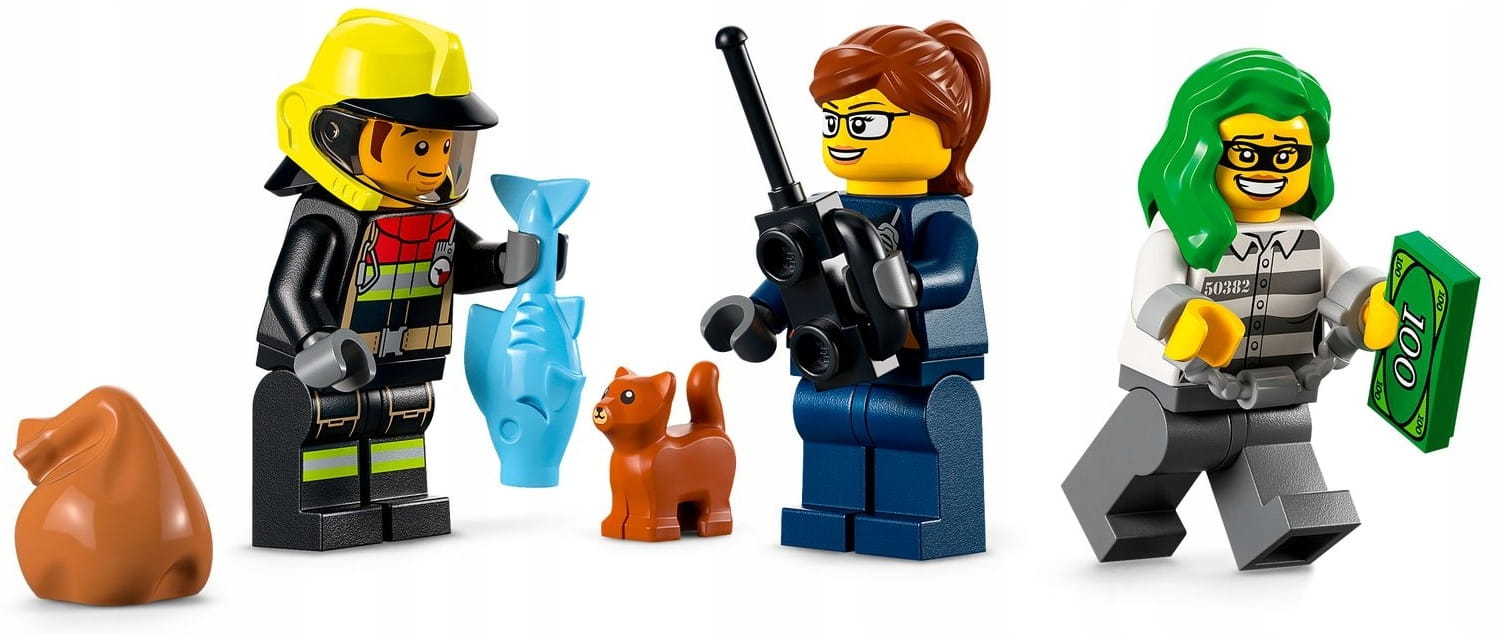 - Zawartość opakowania — w środku jest strażacki pick-up z dronem, motocykl policyjny, samochód złodziejaszka, fragment pożaru z sygnalizatorem świetlnym, figurka kotka i trzy minifigurki, w tym Bob z serialu telewizyjnego LEGO® City