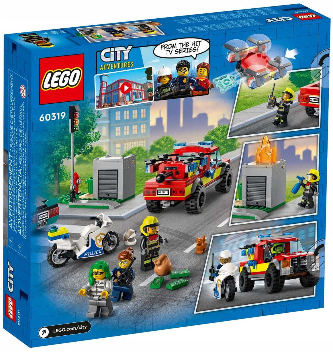 - Pełna akcji zabawka dla pięciolatków i starszych dzieci — zestaw LEGO® City Akcja strażacka i policyjny pościg (60319) otwiera przed dziećmi świat emocjonującej zabawy z postacią z serialu telewizyjnego LEGO City Adventures