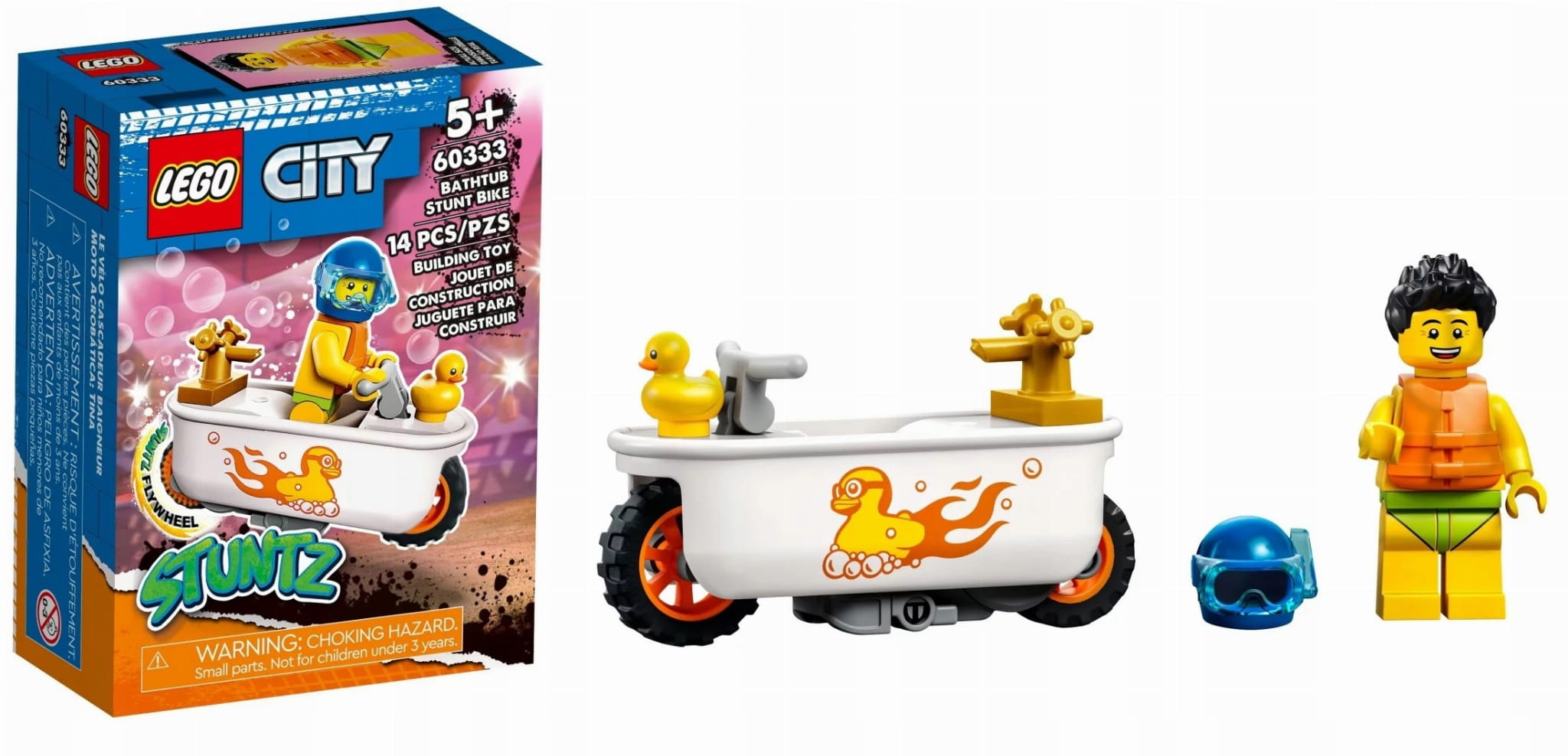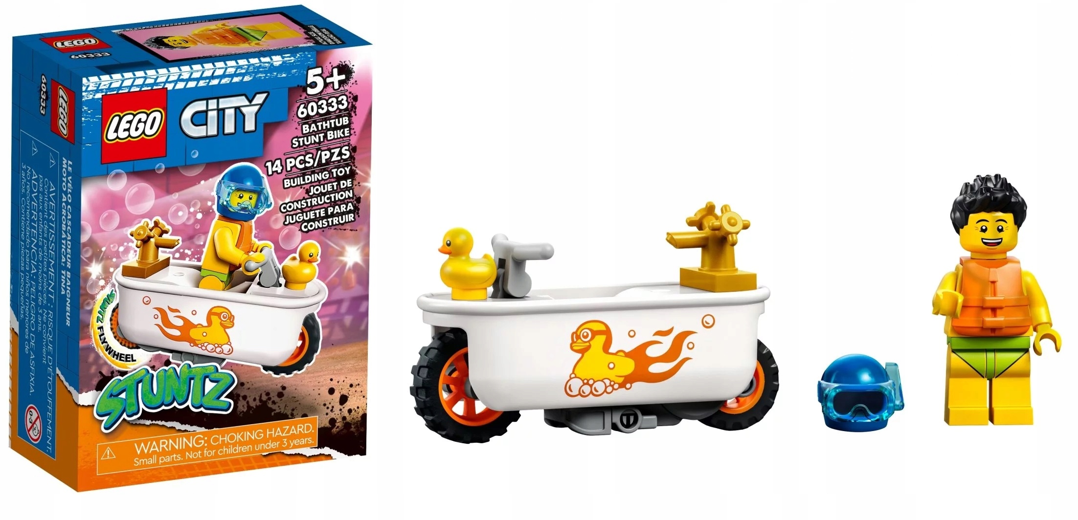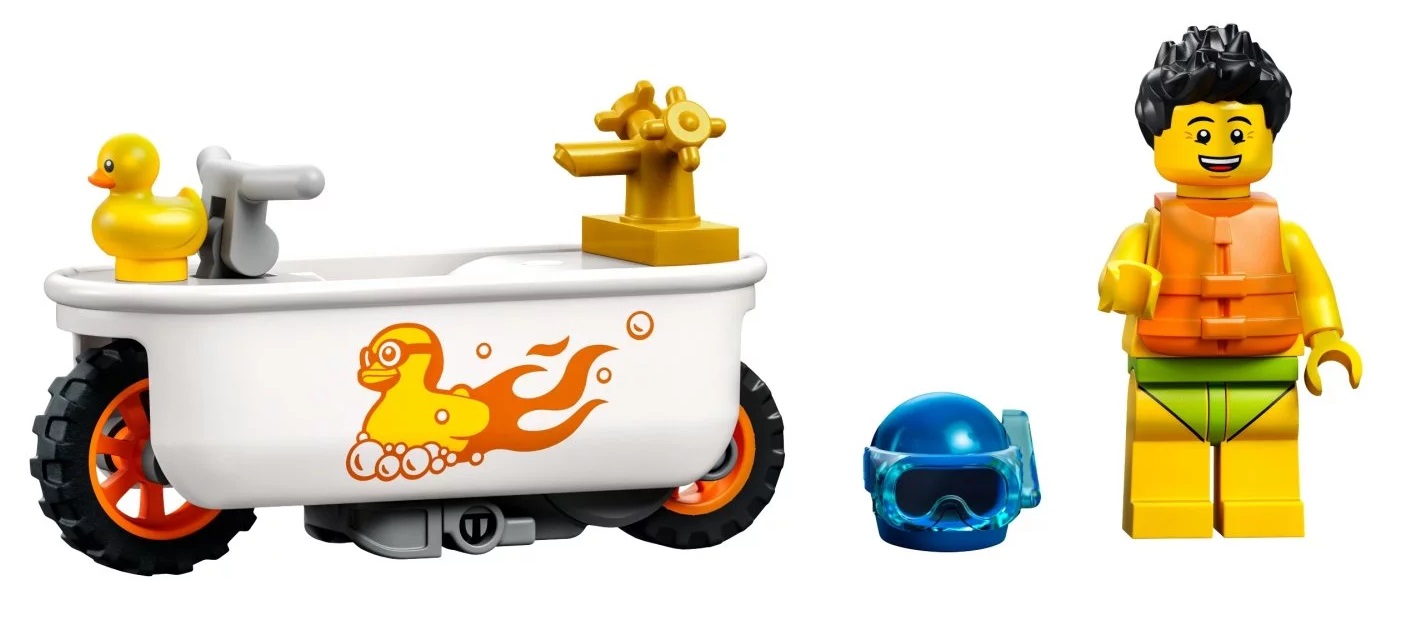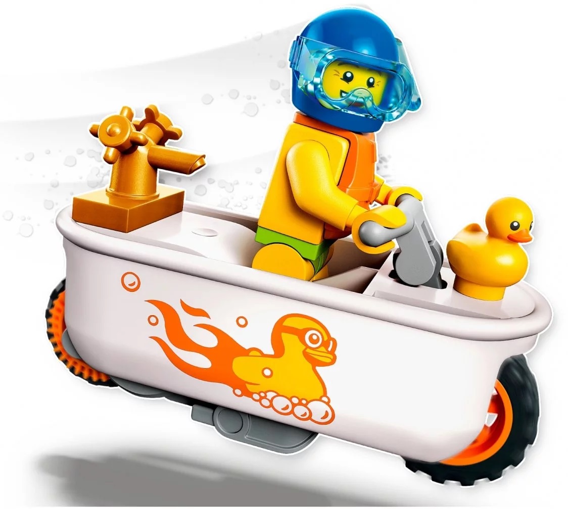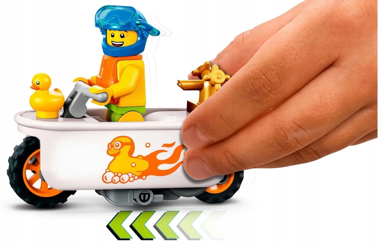 - Zawartość opakowania — w środku jest wszystko, czego dzieci potrzebują do zbudowania motocykla kaskaderskiego z kołem zamachowym, oraz minifigurka LEGO® City Stuntz Szymona Pianki z gumową kaczką, maską do nurkowania i kamizelką ratunkową