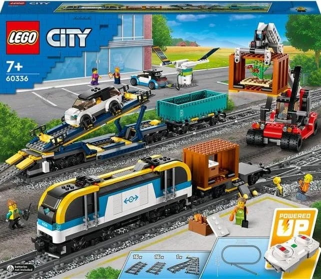 Zdalnie sterowany zestaw LEGO® City Pociąg towarowy (60336) zawiera mnóstwo autentycznych elementów i funkcji. Dzieci znajdą tu lokomotywę z technologią LEGO Powered Up, wagon-platformę z dwoma kontenerami, otwarty wagon, dwupiętrowy wagon do przewozu samochodów i 33 elementy torów kolejowych.