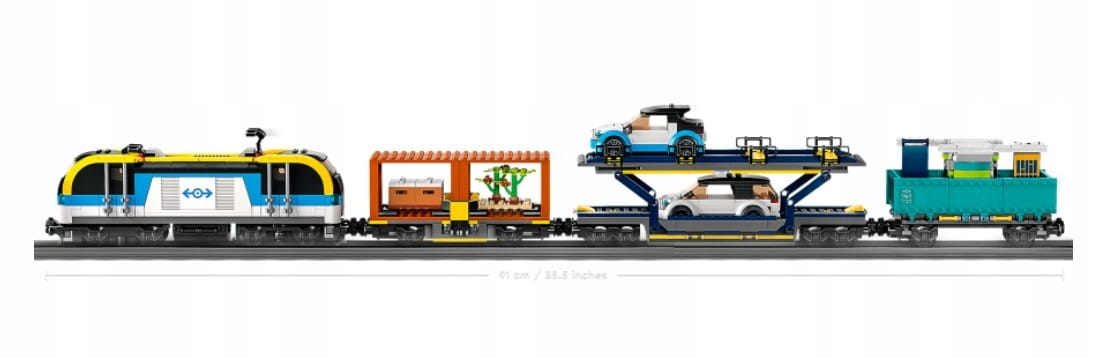 - Wymiary — złożony model pociągu towarowego LEGO® City ma ok. 9 cm wysokości, 90 cm długości i 6 cm szerokości