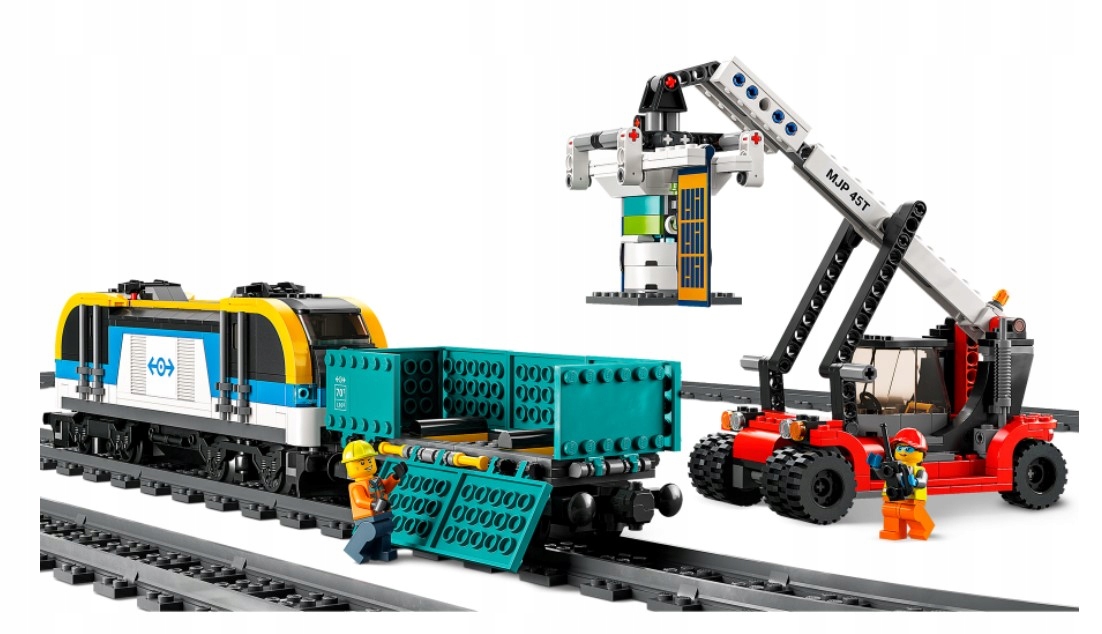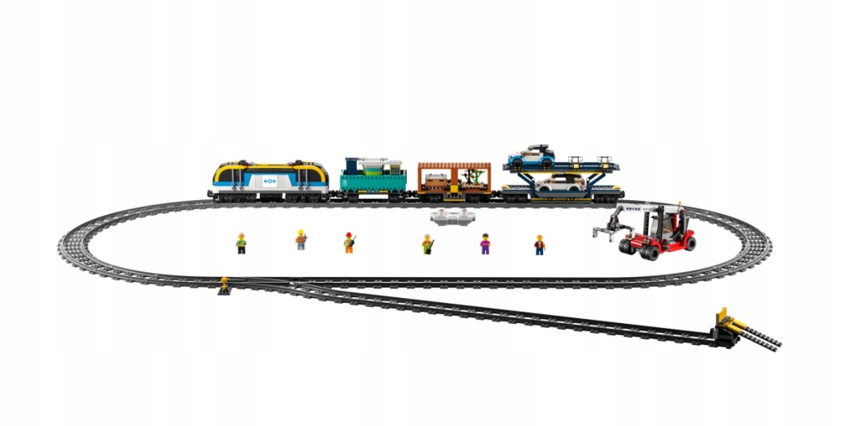 W komplecie są też wózek wysokiego składowania, dwa modele aut elektrycznych i sześć minifigurek, więc kreatywne przygody z pociągiem nie będą miały końca.