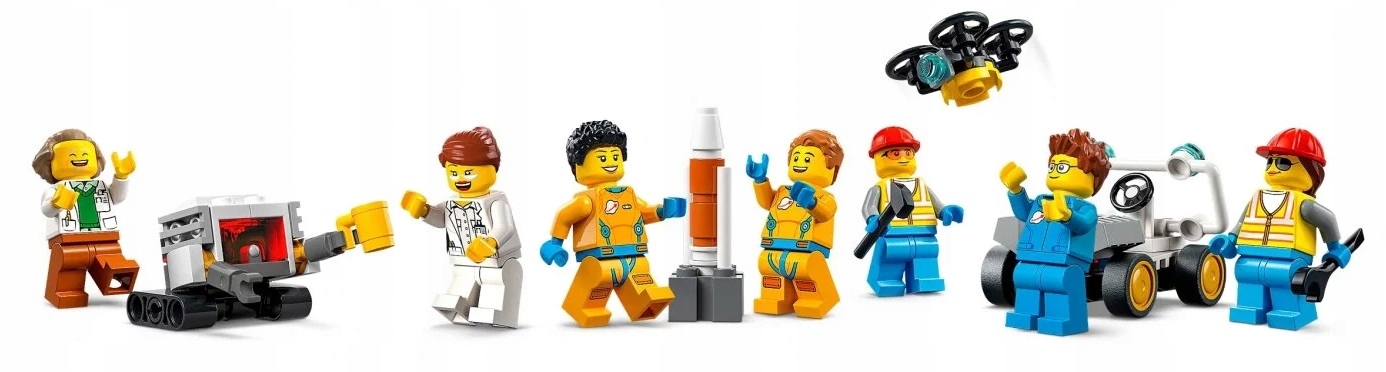 - Zawartość opakowania — w środku jest wszystko, czego dzieci potrzebują do zbudowania rakiety, wieży startowej, szczegółowego obserwatorium i centrum lotów kosmicznych, a do tego pojazd serwisowy, łazik planetarny, dron i sześć minifigurek