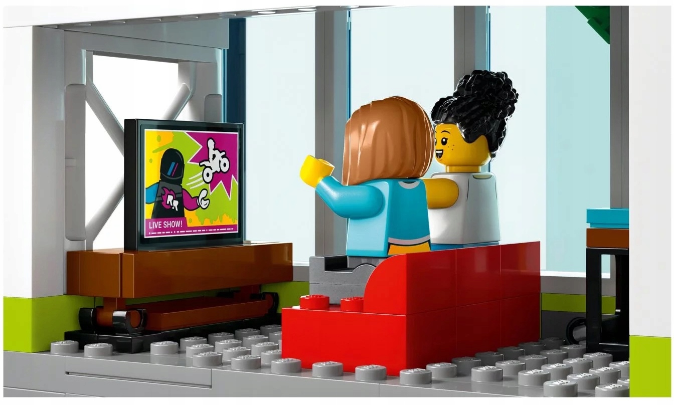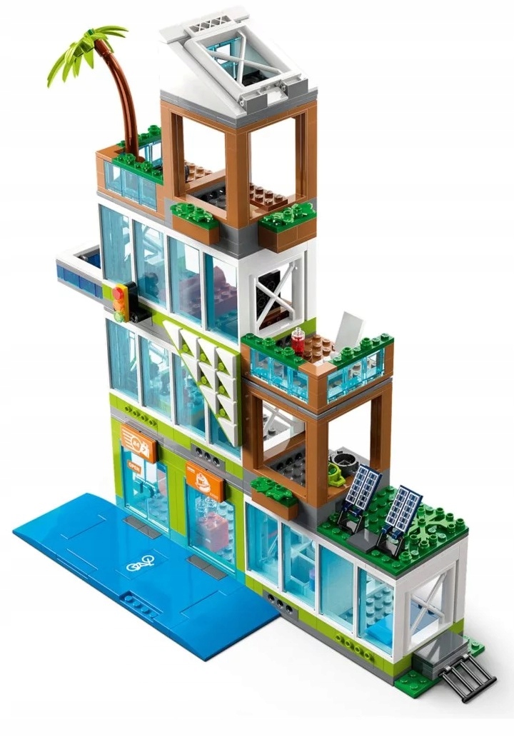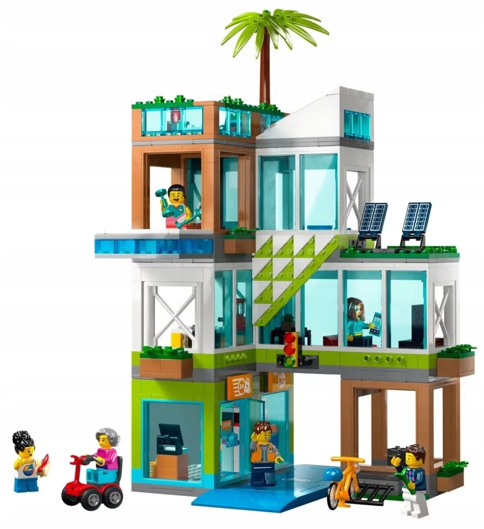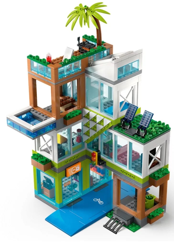 - Co jest w pudełku? — Ten zestaw zawiera apartamentowiec z zabawkowymi panelami słonecznymi, sklep spożywczy, salon, kuchnię, sypialnię i łazienkę, a także rower, skuter inwalidzki i sześć minifigurek