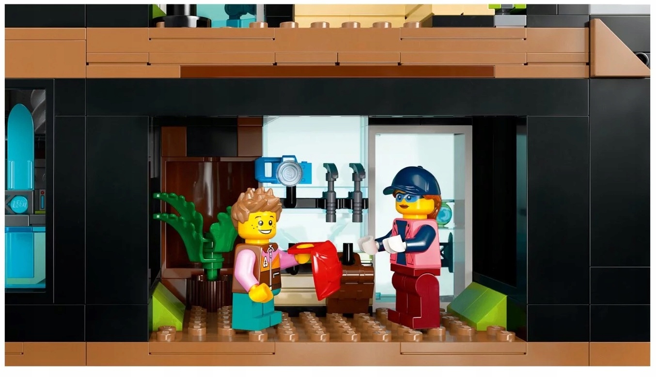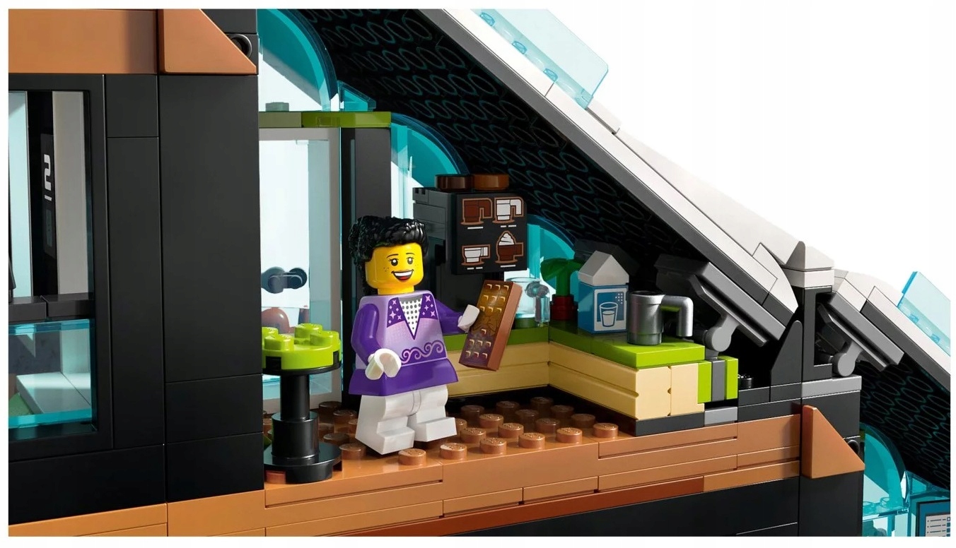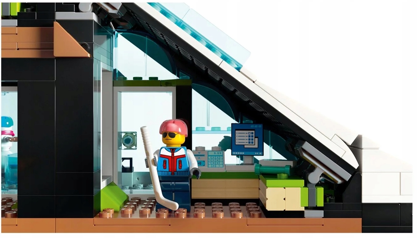 - Co jest w pudełku? — Wszystko, czego dzieci potrzebują do zbudowania modułowego trzypiętrowego budynku ze sklepem, kawiarnią i stokiem, a także osiem minifigurek z akcesoriami narciarskimi oraz figurki bałwana, sowy i wiewiórki