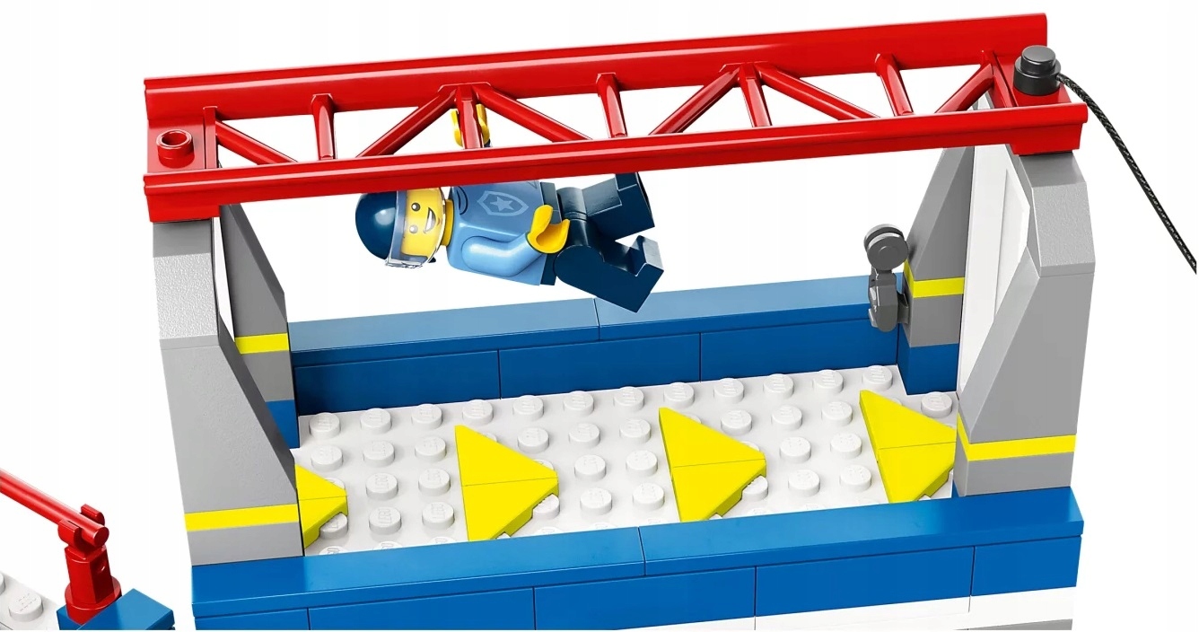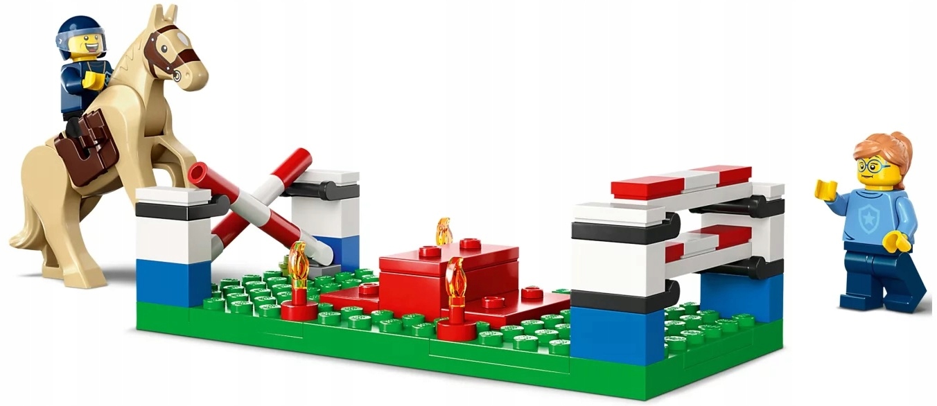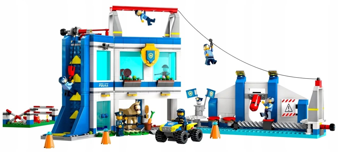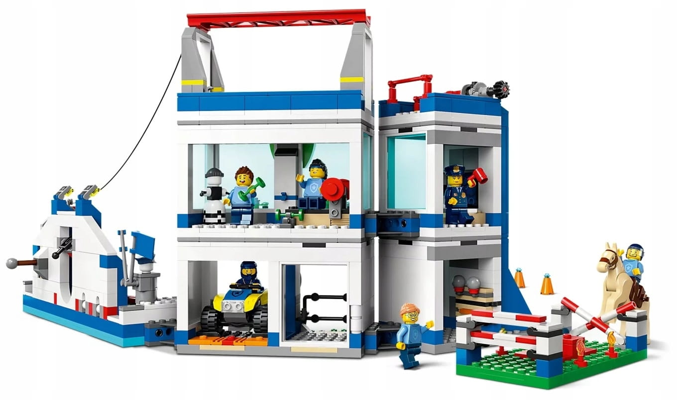 - Co jest w pudełku? – Zestaw zawiera dwupiętrowy posterunek policji z wieloma akcesoriami szkoleniowymi dla policjantów z LEGO® City, a także quada, sześć minifigurek i figurkę konia