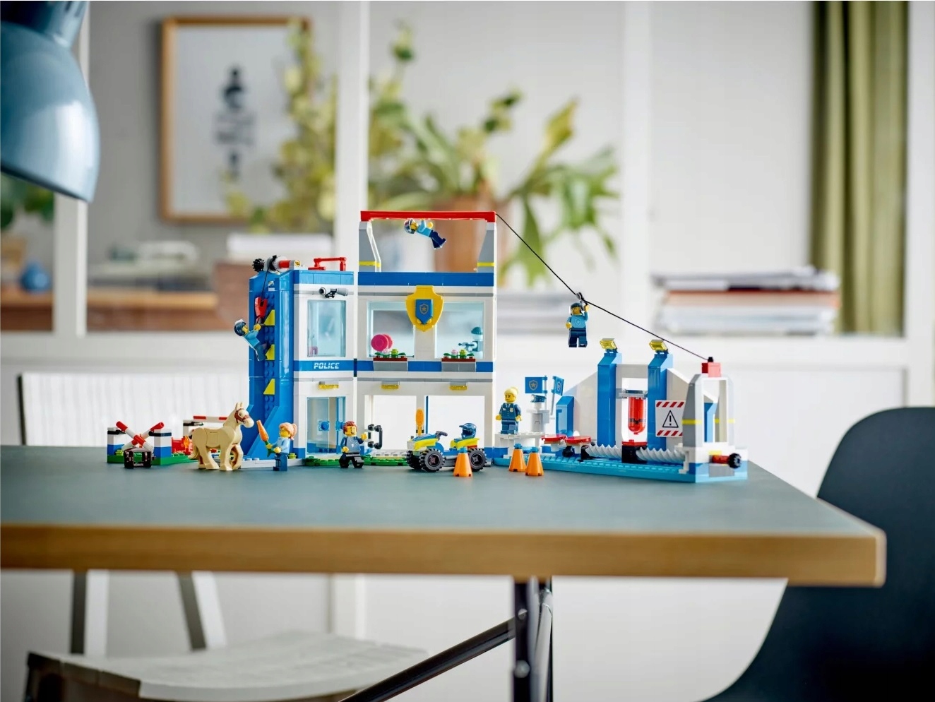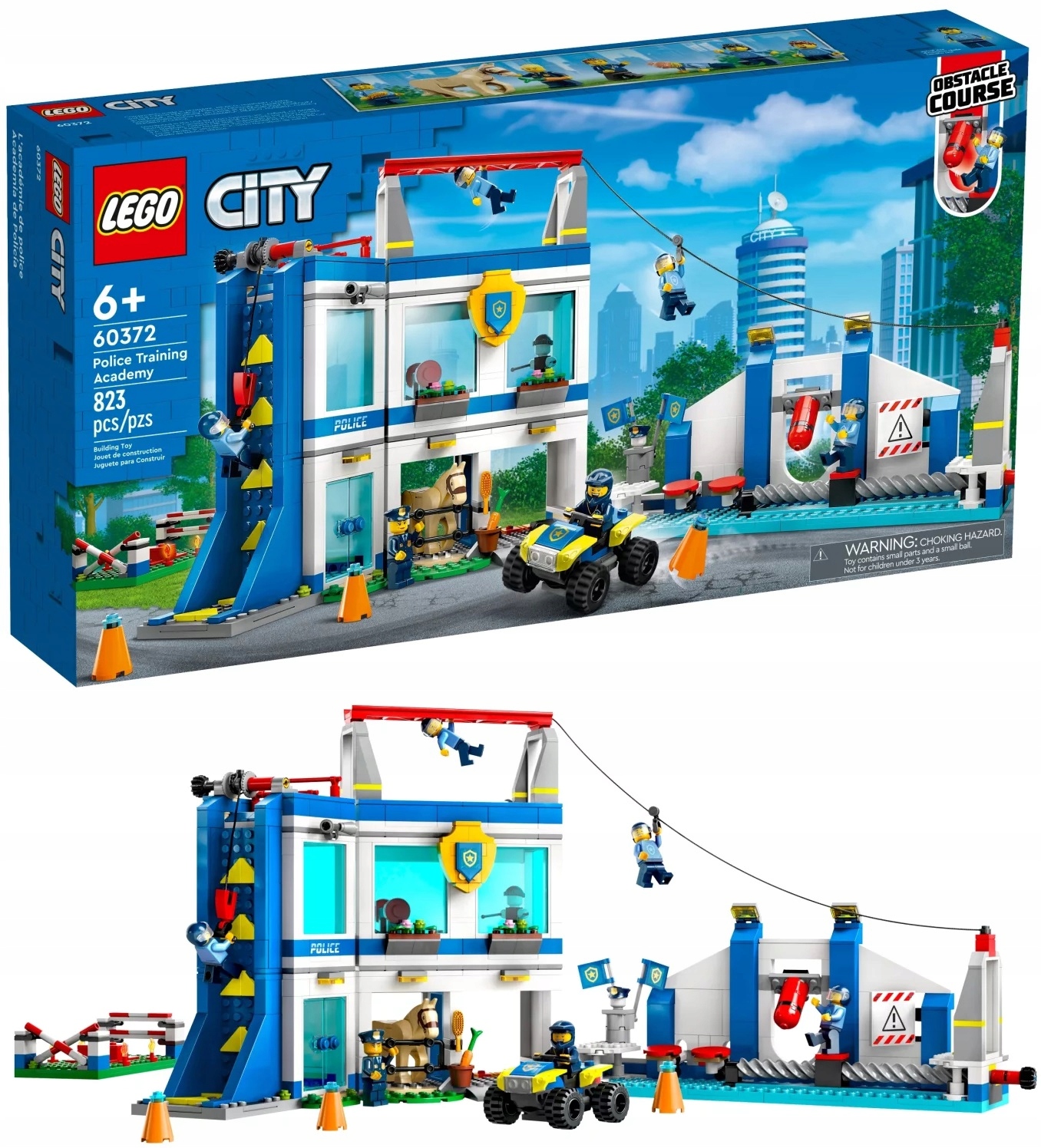 Zestaw LEGO® City Akademia policyjna (60372) zawiera modułowy posterunek policji z kilkoma pomieszczeniami i tor przeszkód ze ścianką wspinaczkową, małpim gajem i tyrolką.